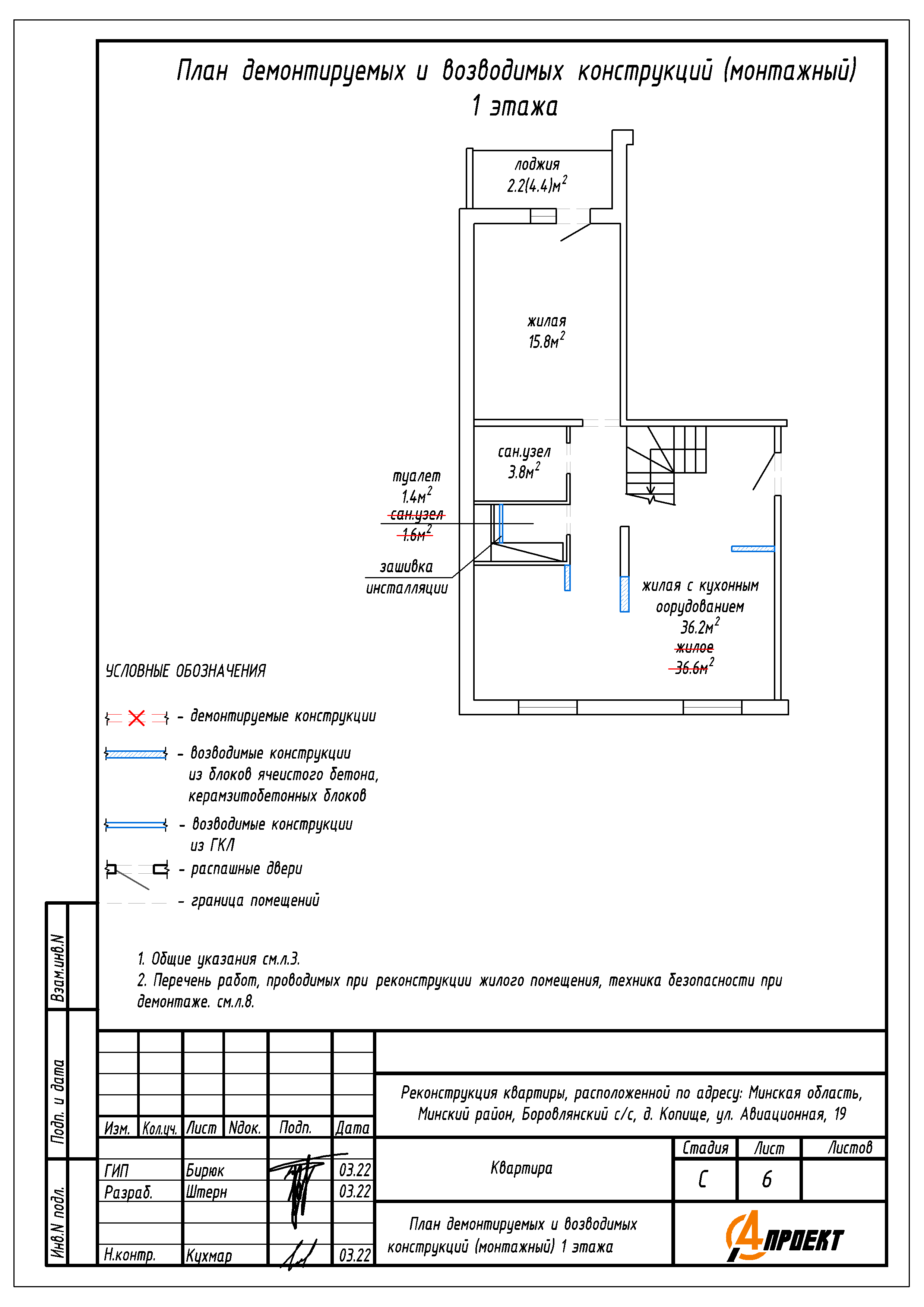 - Устройство перегородок на площади жилого, с последующим образованием жилой с кухонным оборудованием;