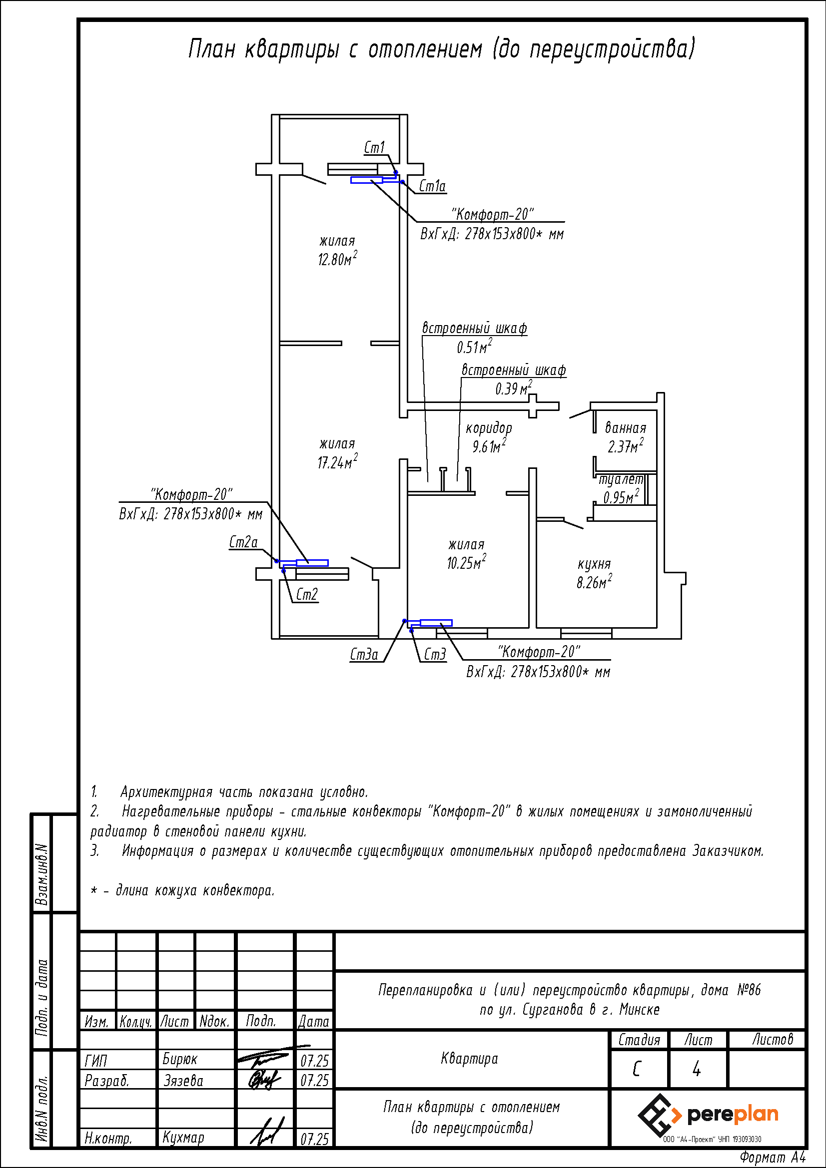 ОВ – Отопление и вентиляция – Перенос помещения кухни, замена радиаторов отопления.