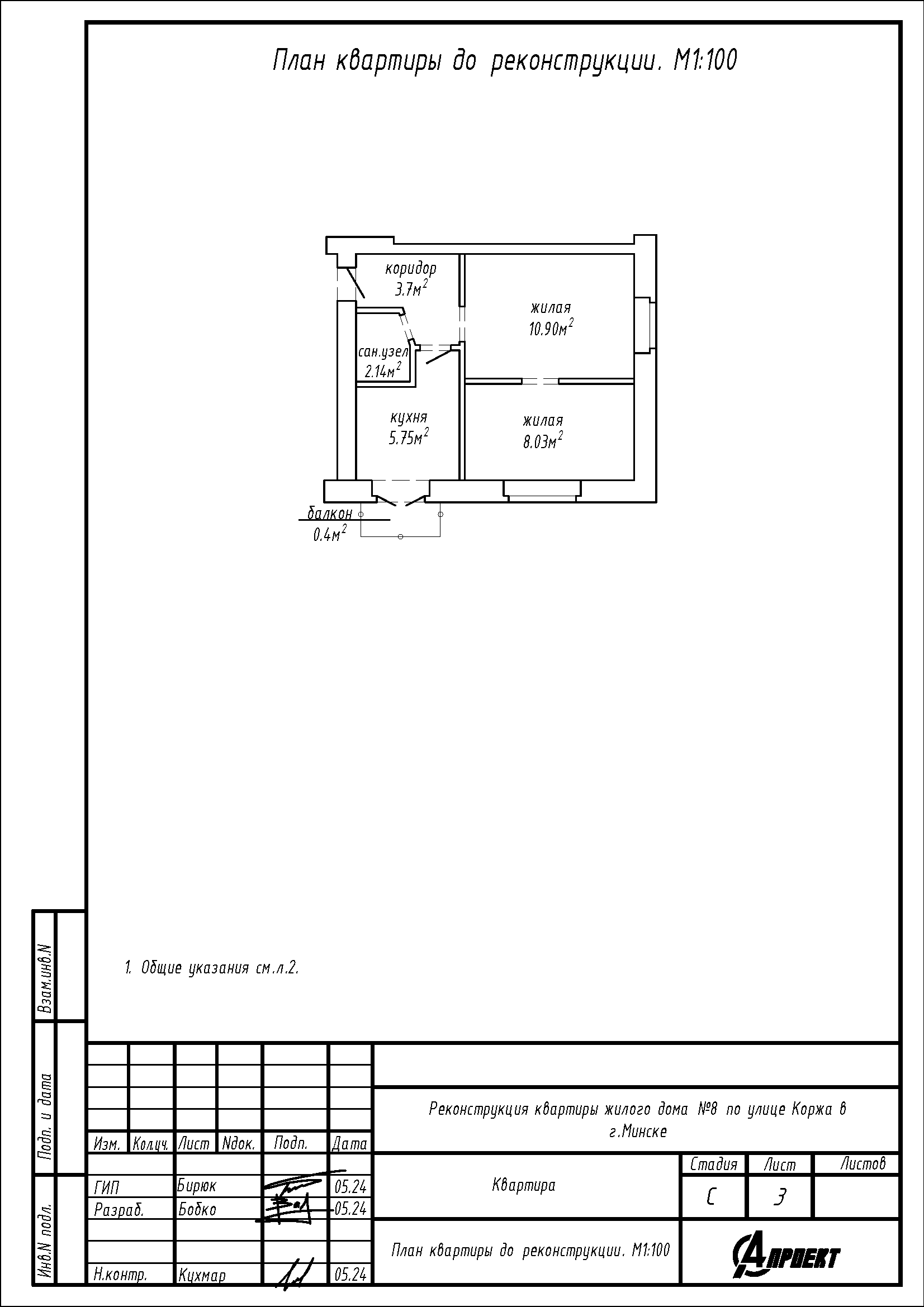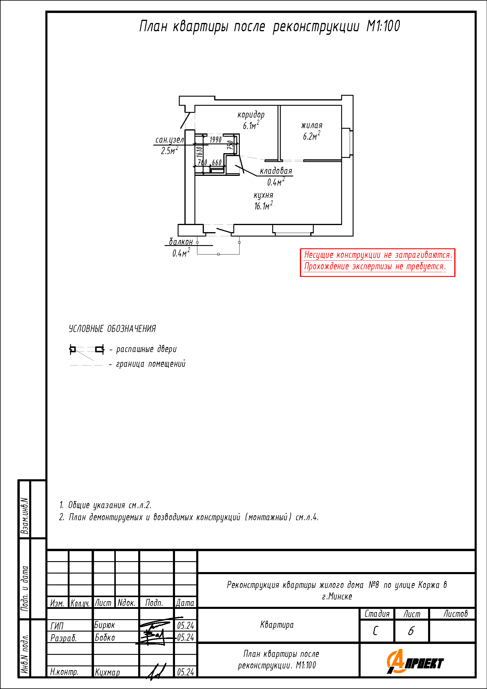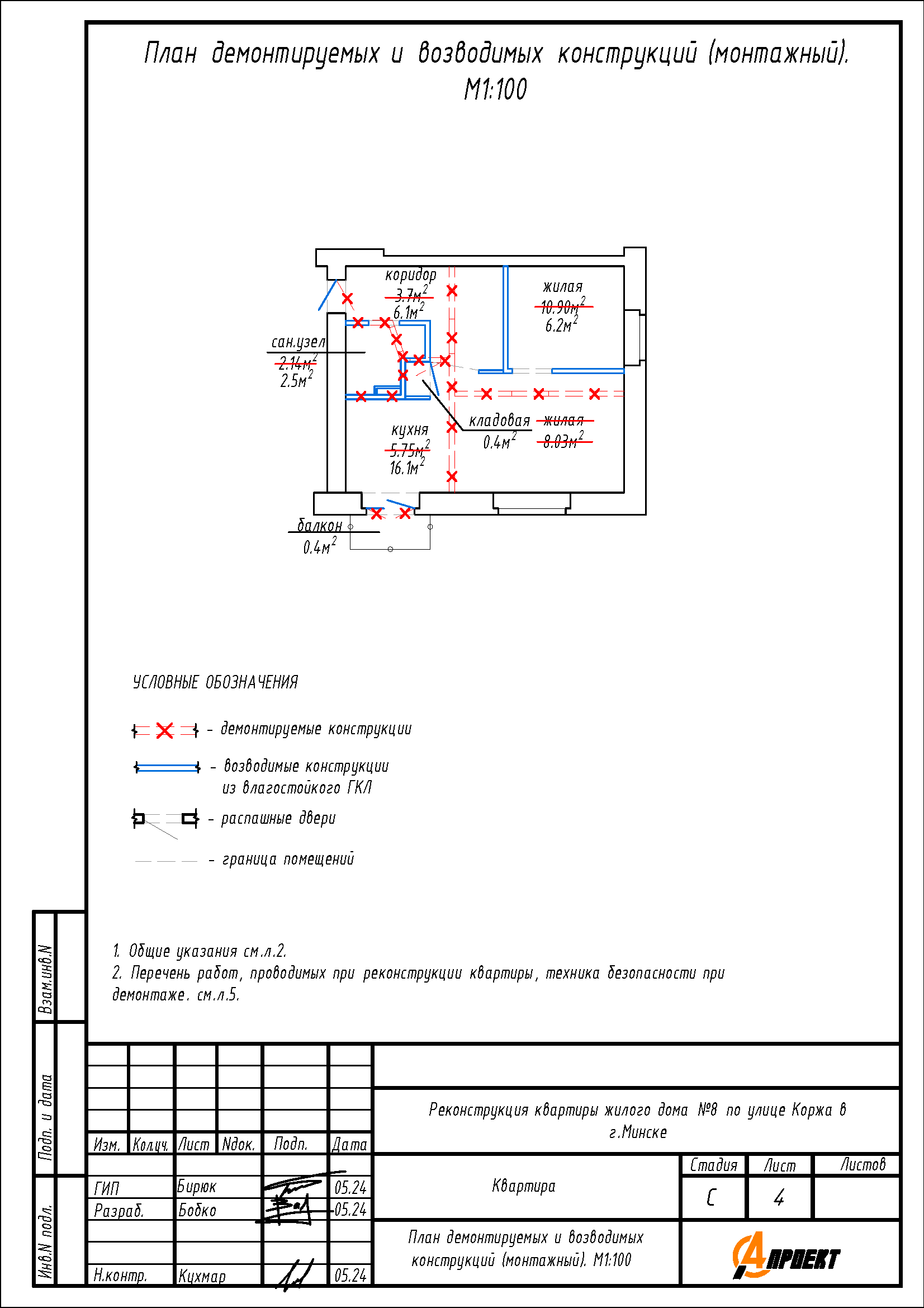- Устройство перегородки на месте демонтируемой перегородки между кухней и сан.узлом, перегородки между кухней и коридором с целью устройства кладовой на части площади кухни;