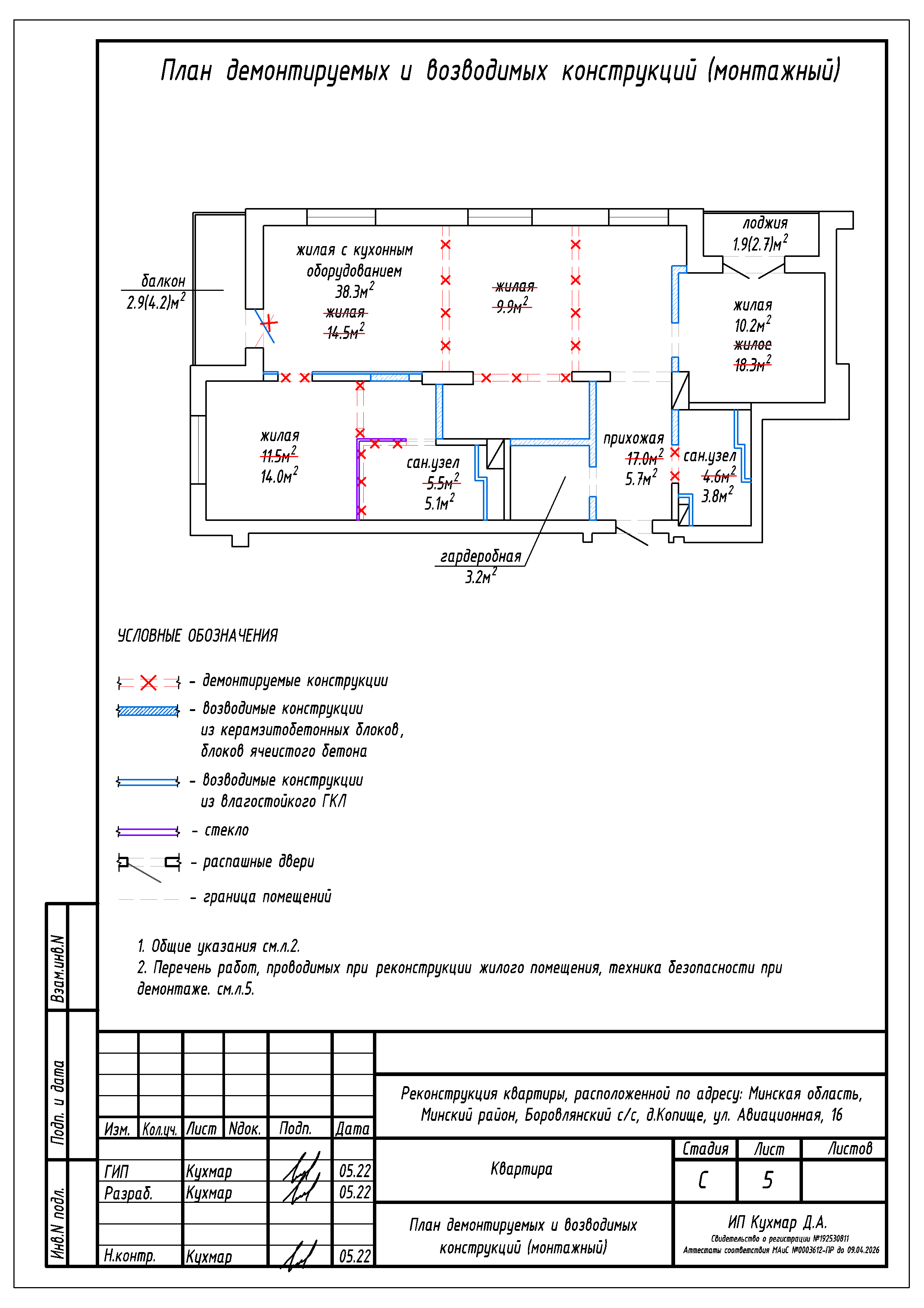 - Закладка дверного проёма между жилой и части прихожей с последующим демонтажем существующей перегородки между жилой и жилой (установка дверных проёмов);