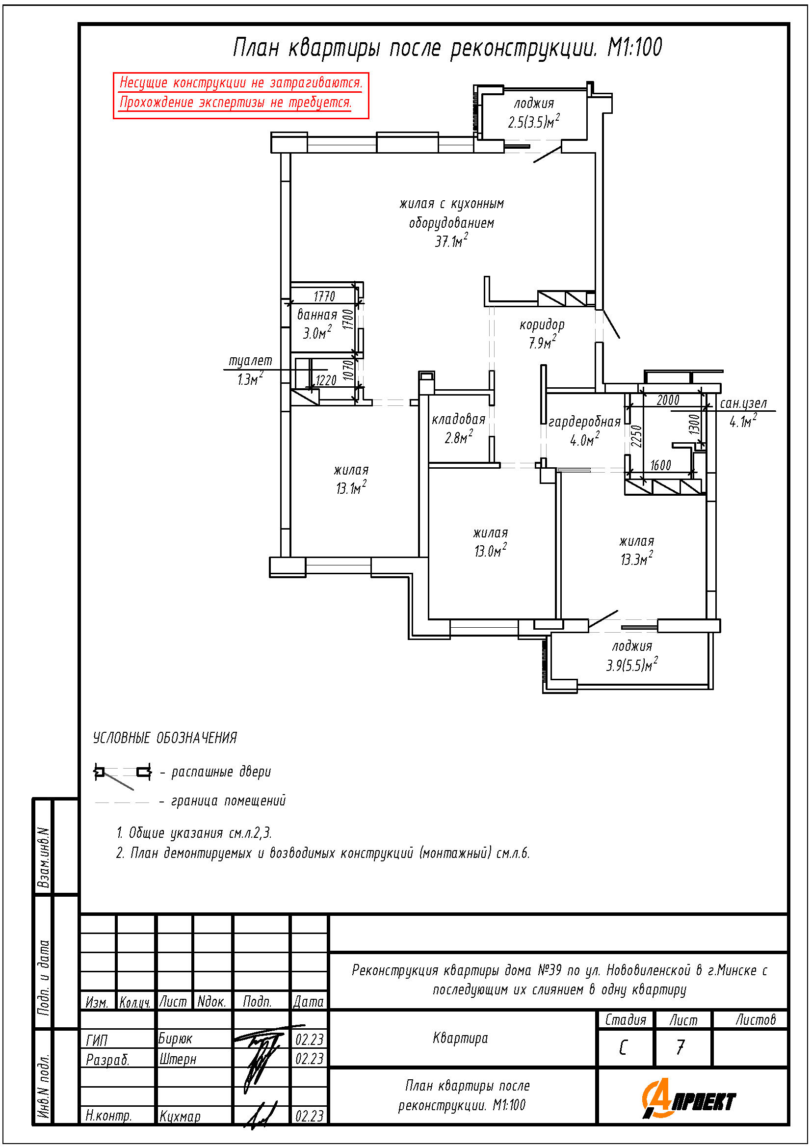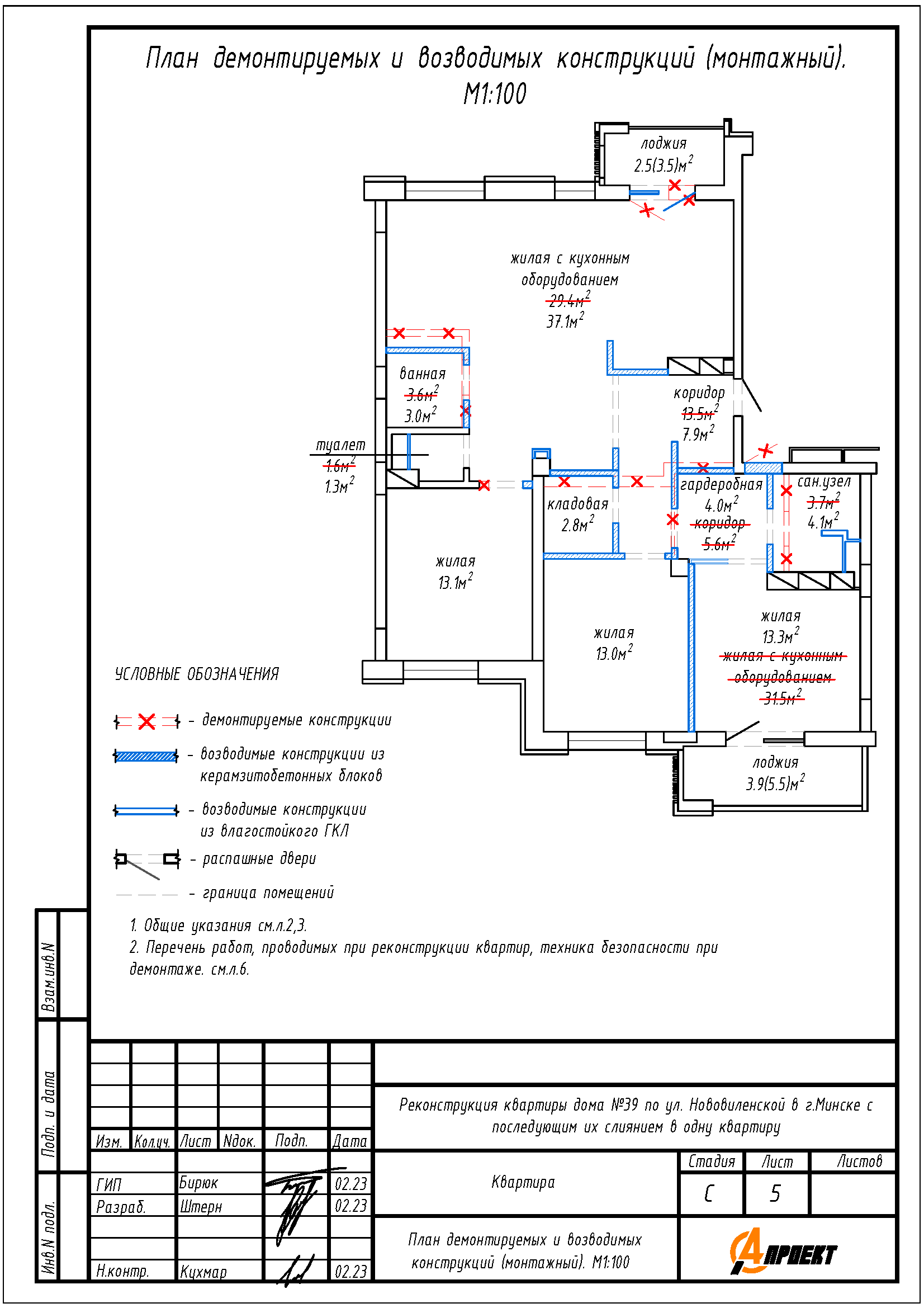 - Демонтаж дверного блока, части простенка между лоджией и жилой с кухонным оборудованием, с последующим устройством нового дверного блока без создания отапливаемого помещения;