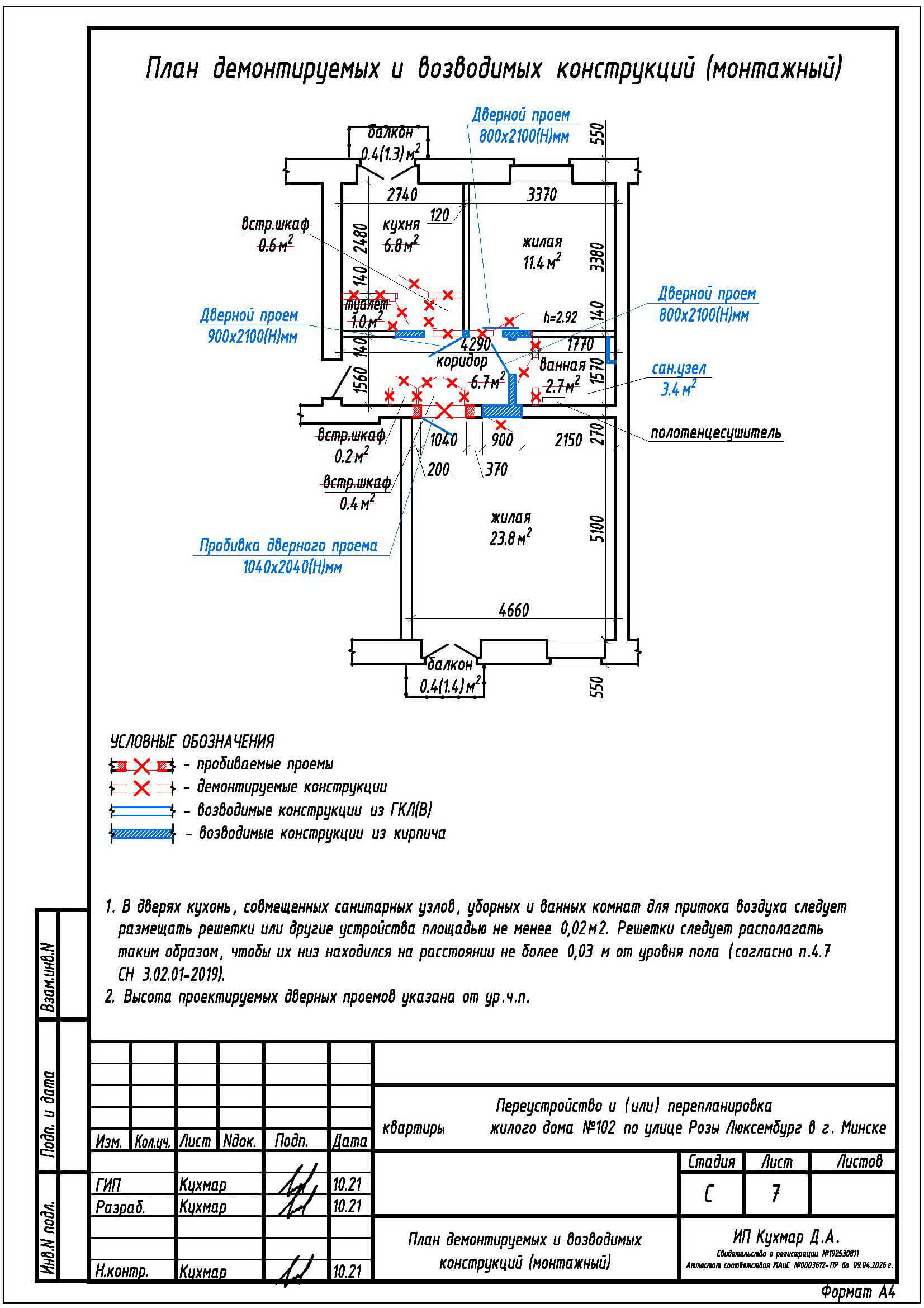 - Закладка дверного проема в стене между коридором 6.7 м2 и жилой комнатой 23.8 м2;