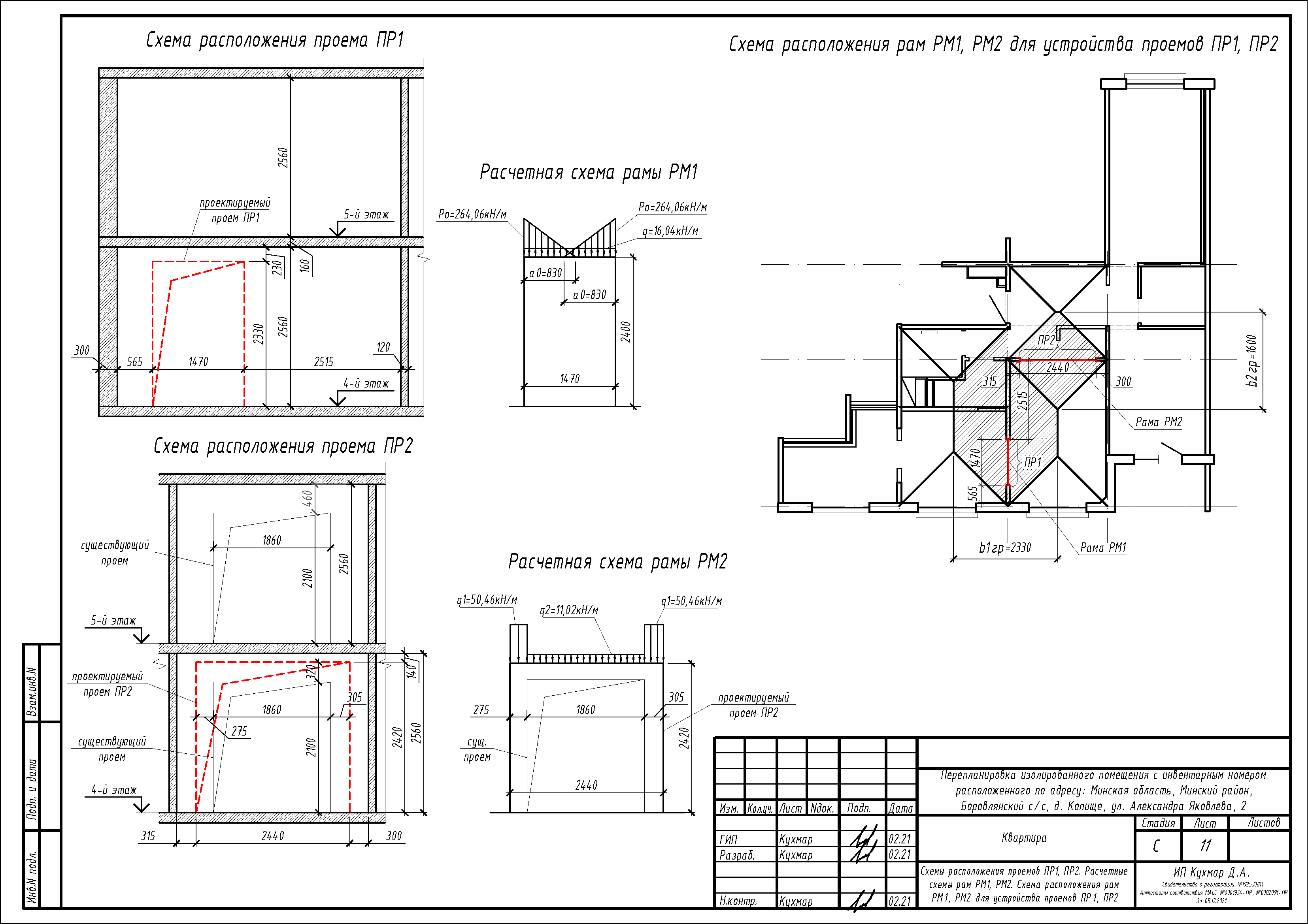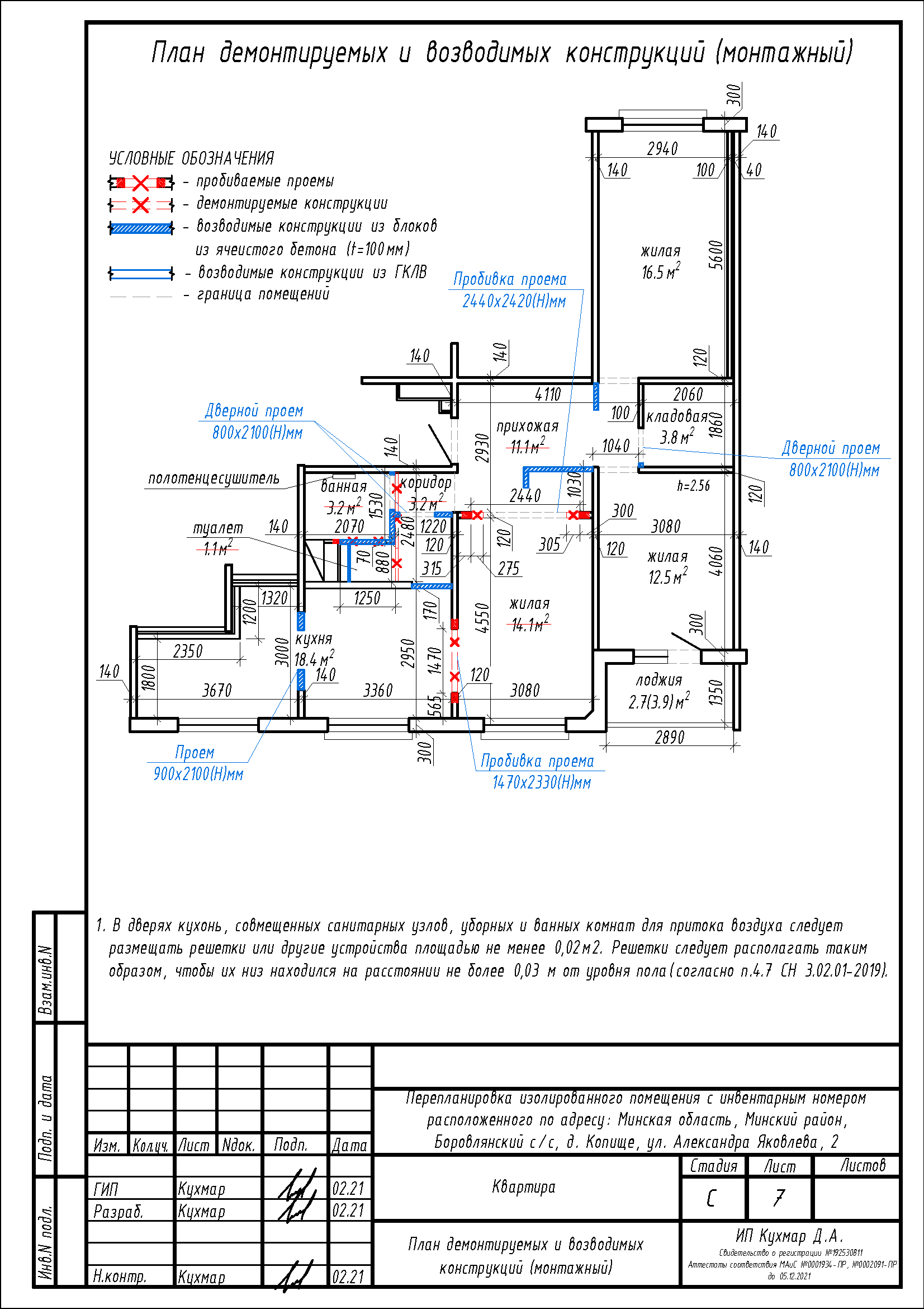 - Расширение дверных проёмов в несущих стенах между жилой и кухней, прихожей и жилой;