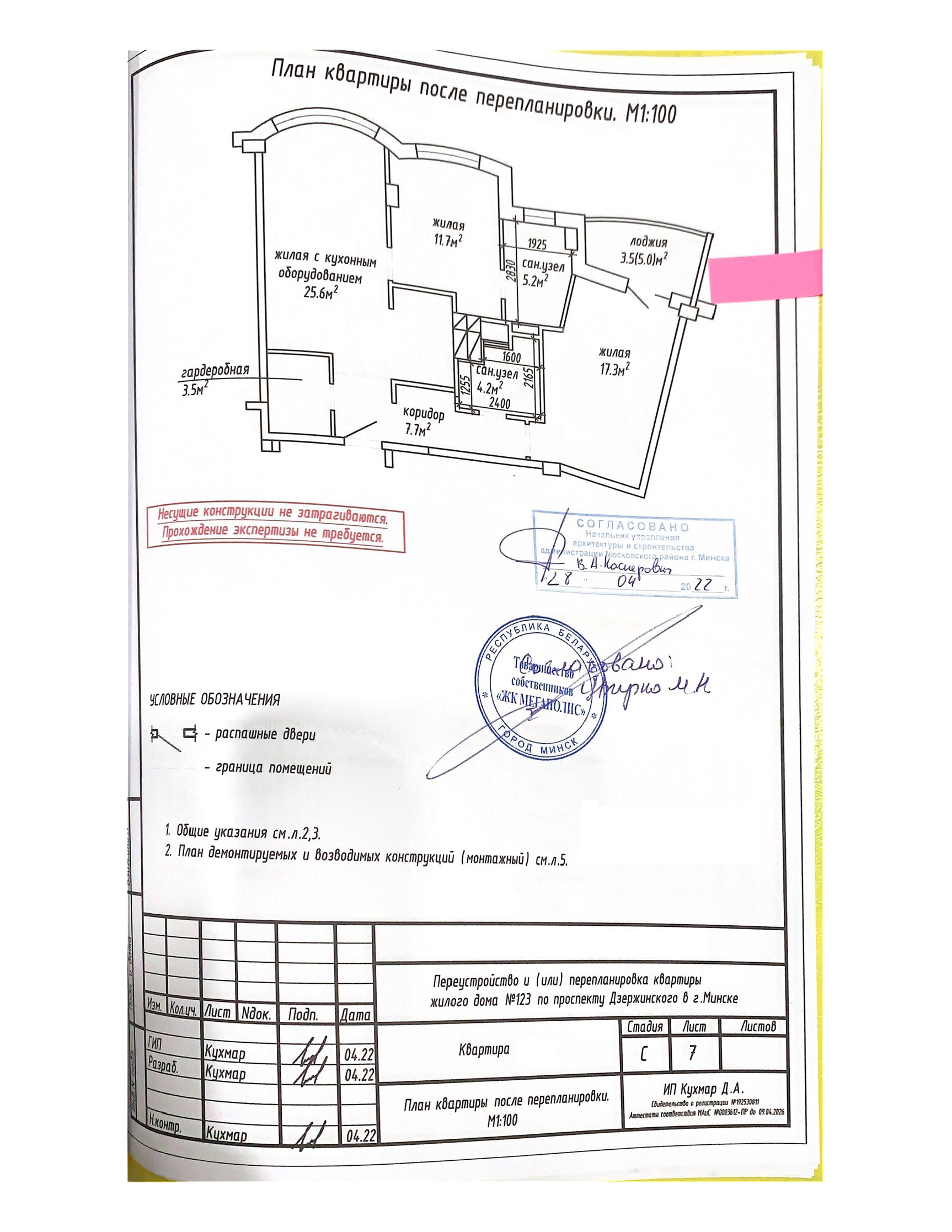 - Устройство перегородок с дверными проемами в жилой с кухонным оборудованием с целью устройства жилой с кухонным оборудованием, двух жилых комнат, гардеробной и коридора.