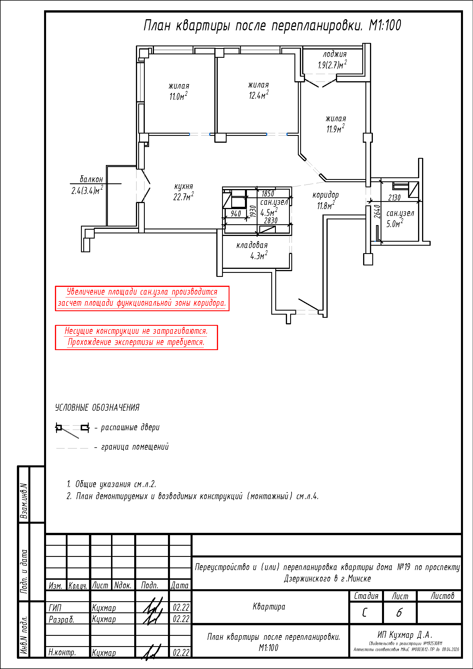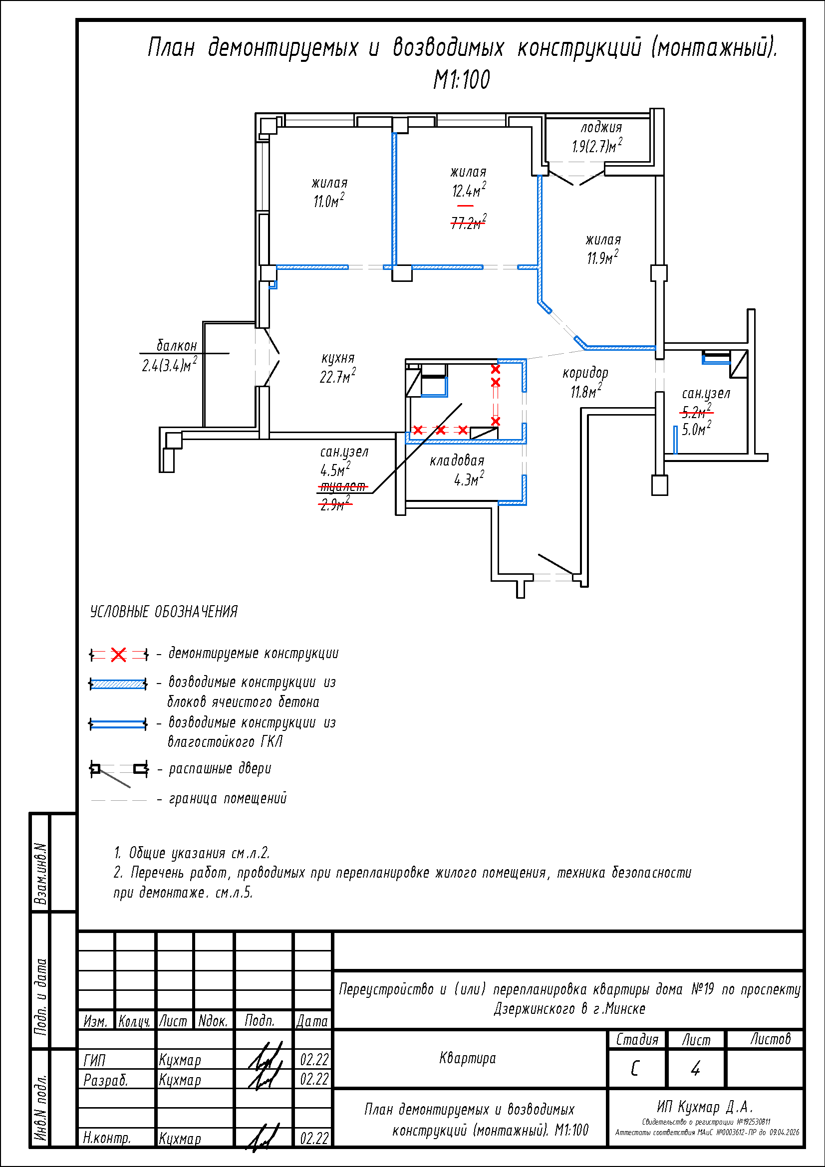 - Устройство перегородок с дверными проемами в жилой с кухонным оборудованием с целью устройства кухни, трех жилых комнат, кладовой и коридора на части площади жилой с кухонным оборудованием;
