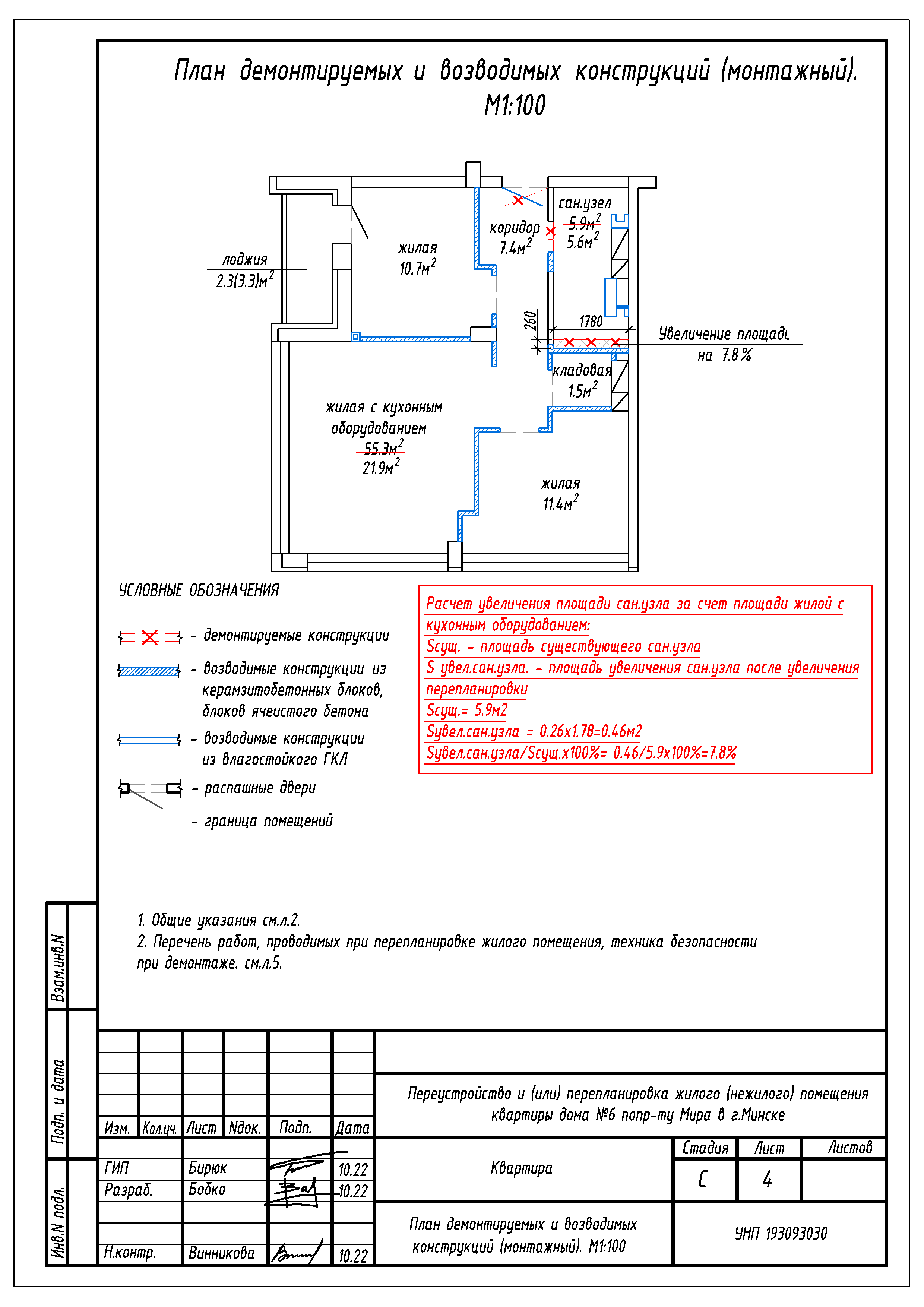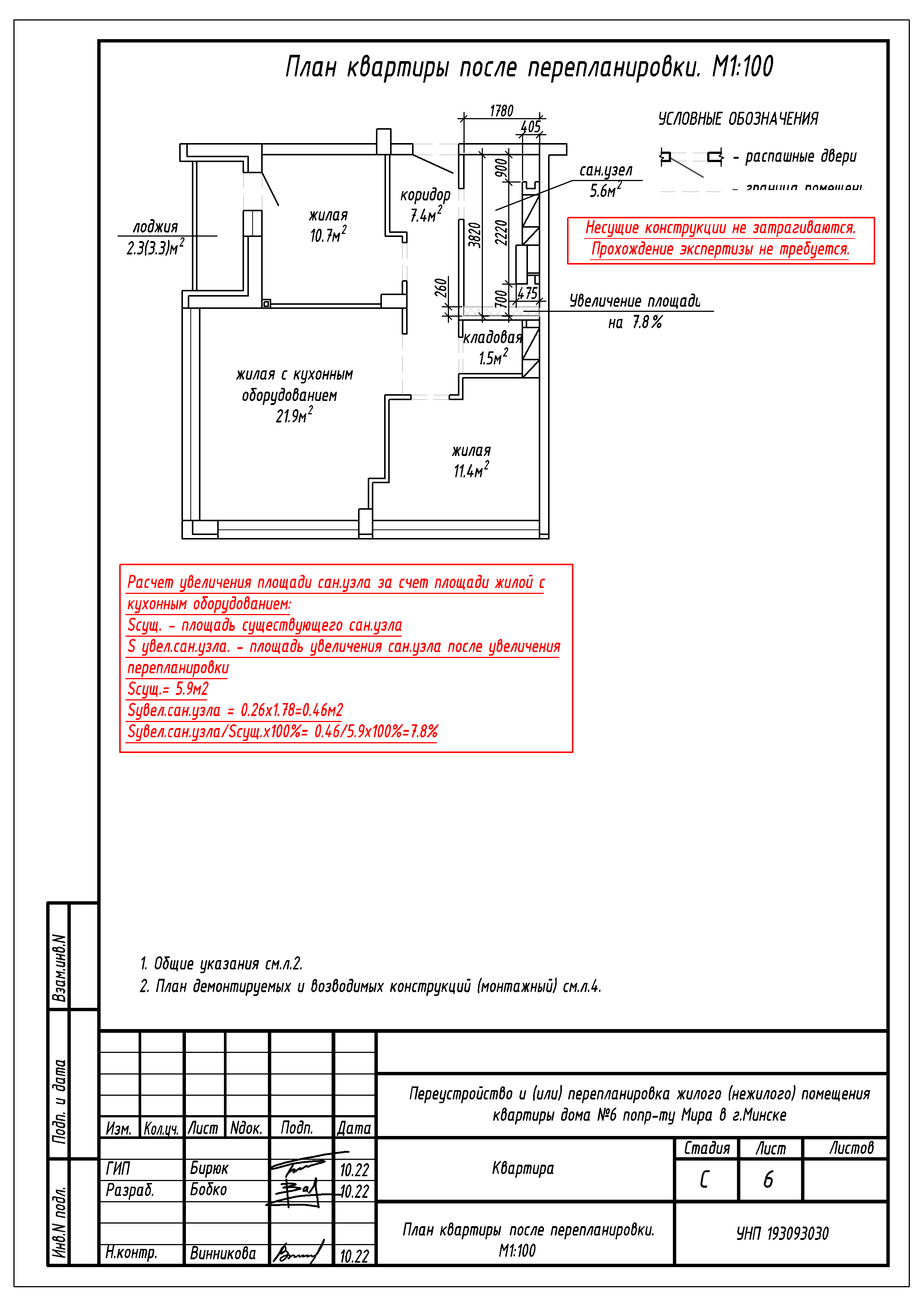 - Увеличение площади санузла за счёт жилой с кухонным оборудованием, что является меньше допустимого увеличения (25%);