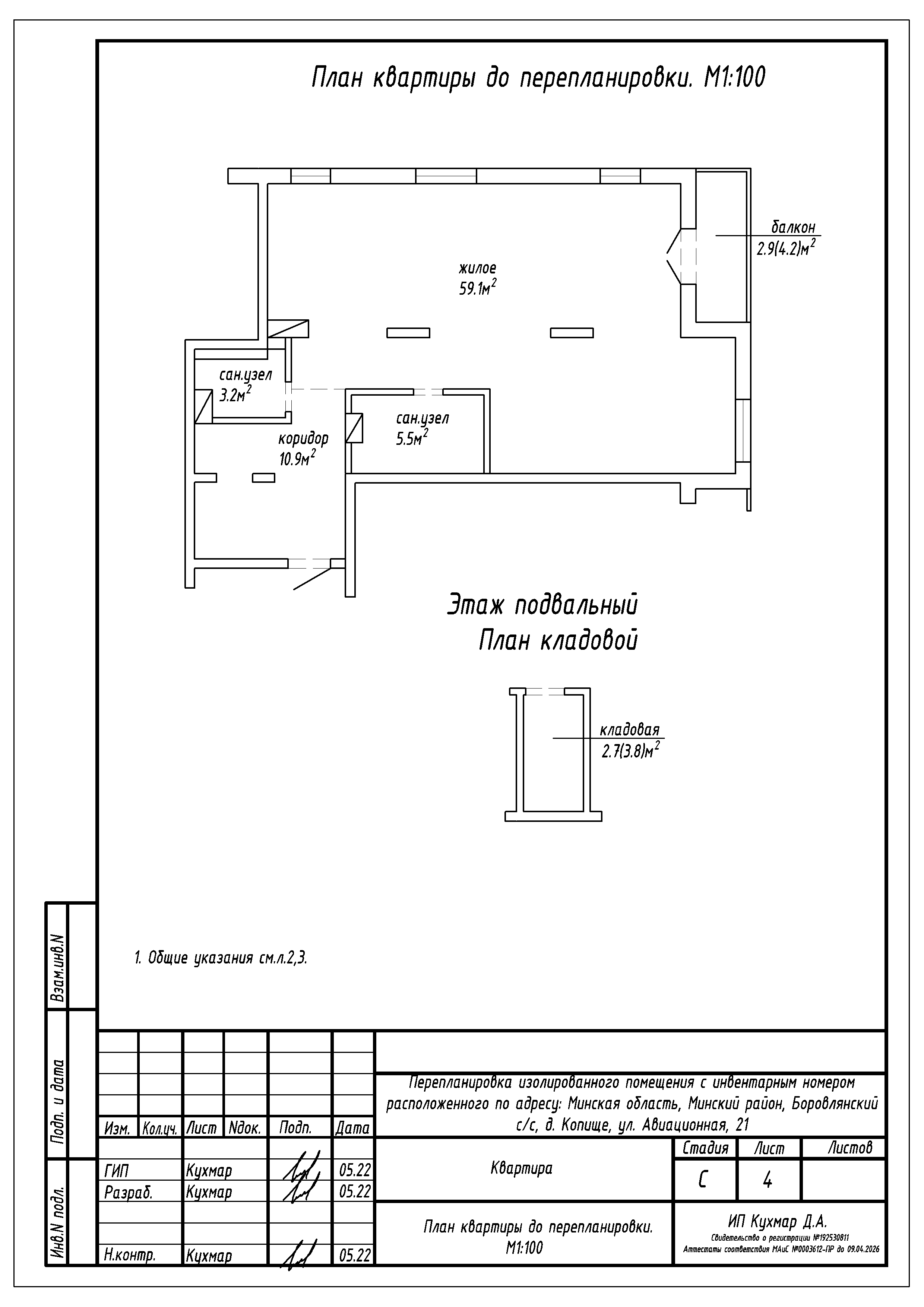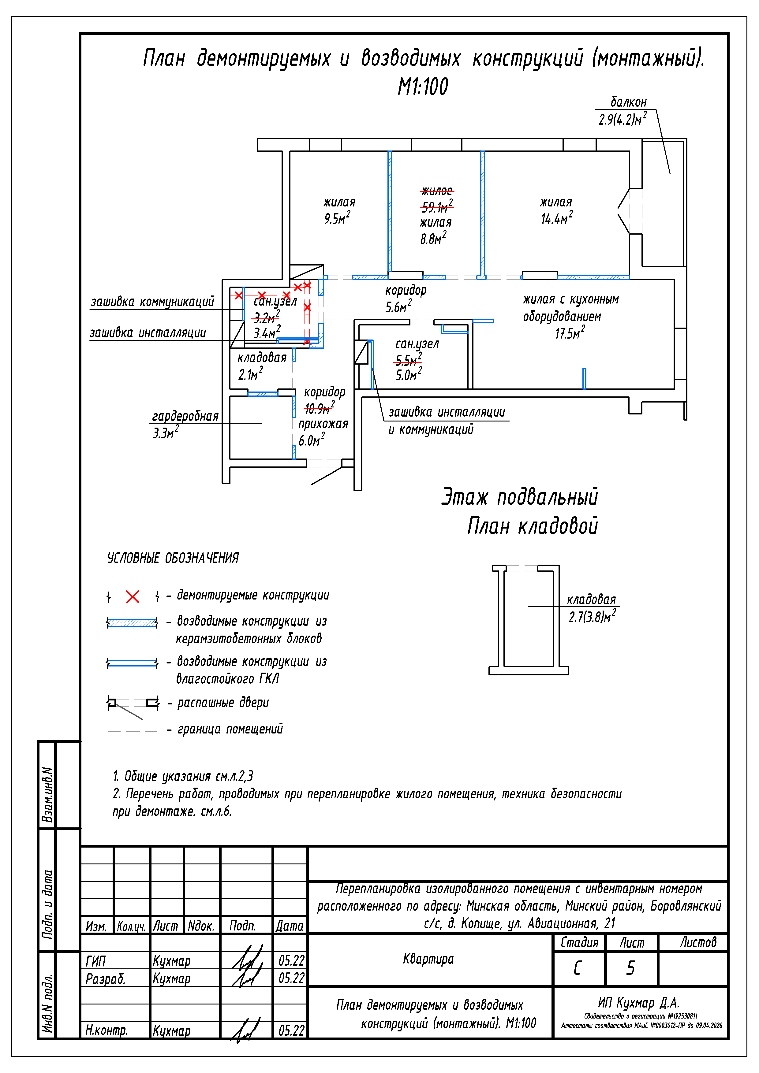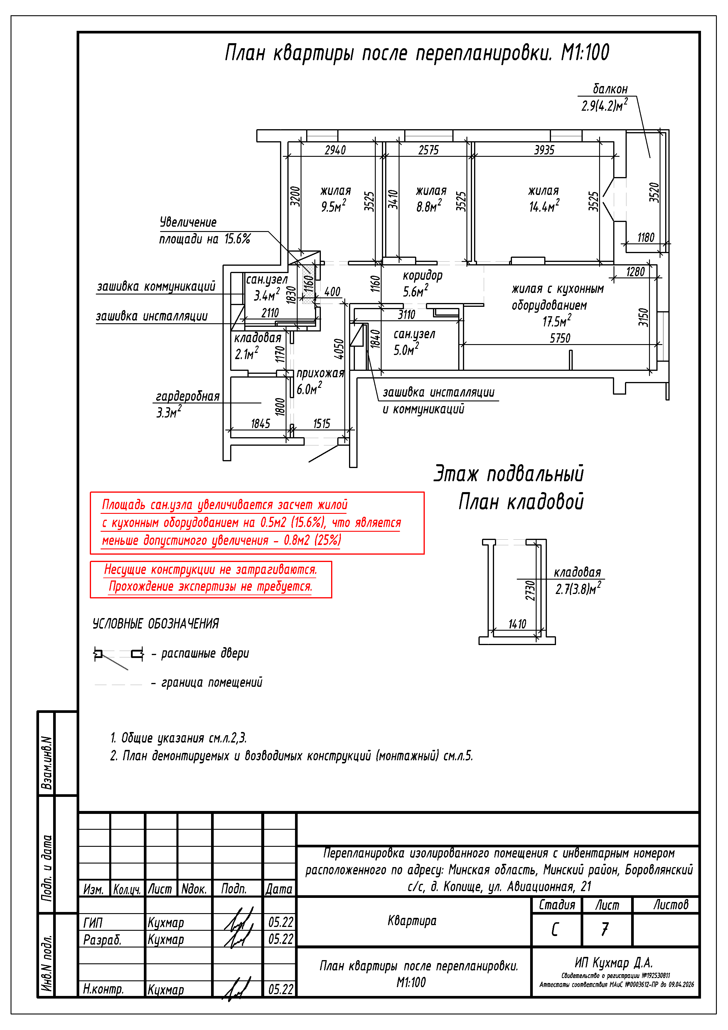 - Разделение общего жилого на жилое с кухонным оборудованием, три жилые, кладовую, коридор и гардеробную;