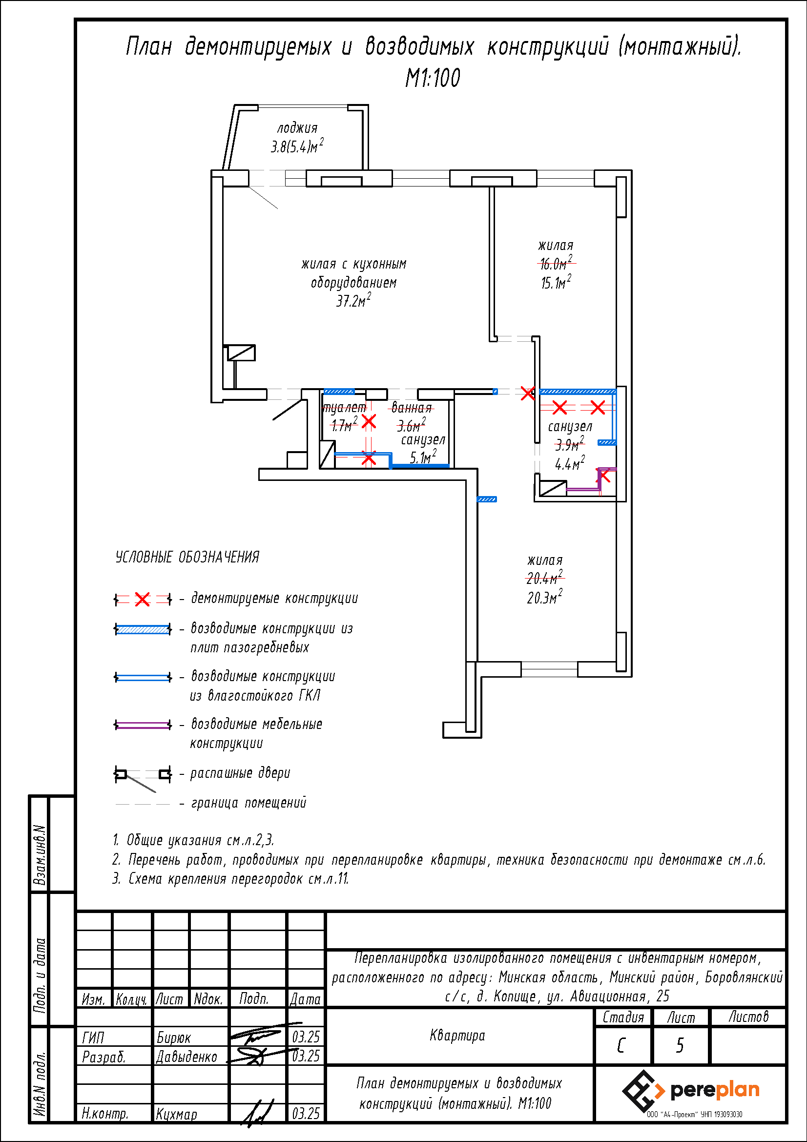 - Устройство перегородки на площади жилой (10-5), санузла;