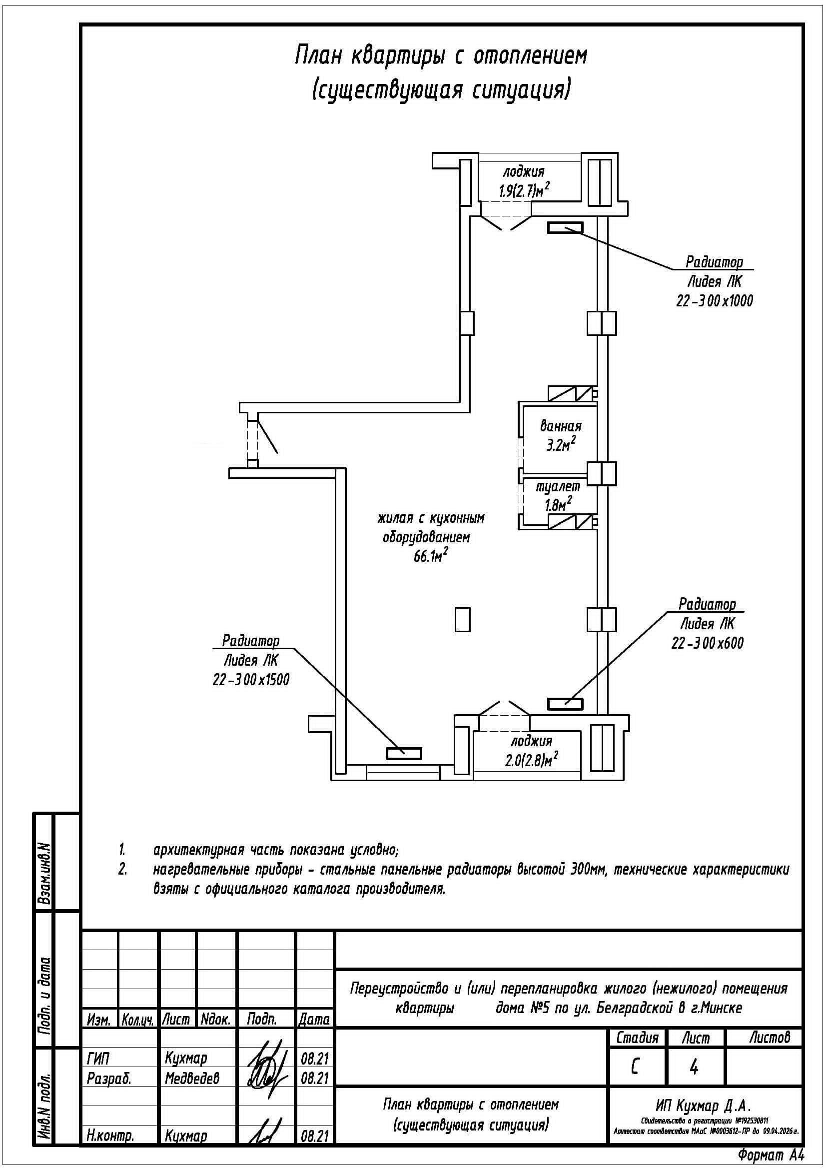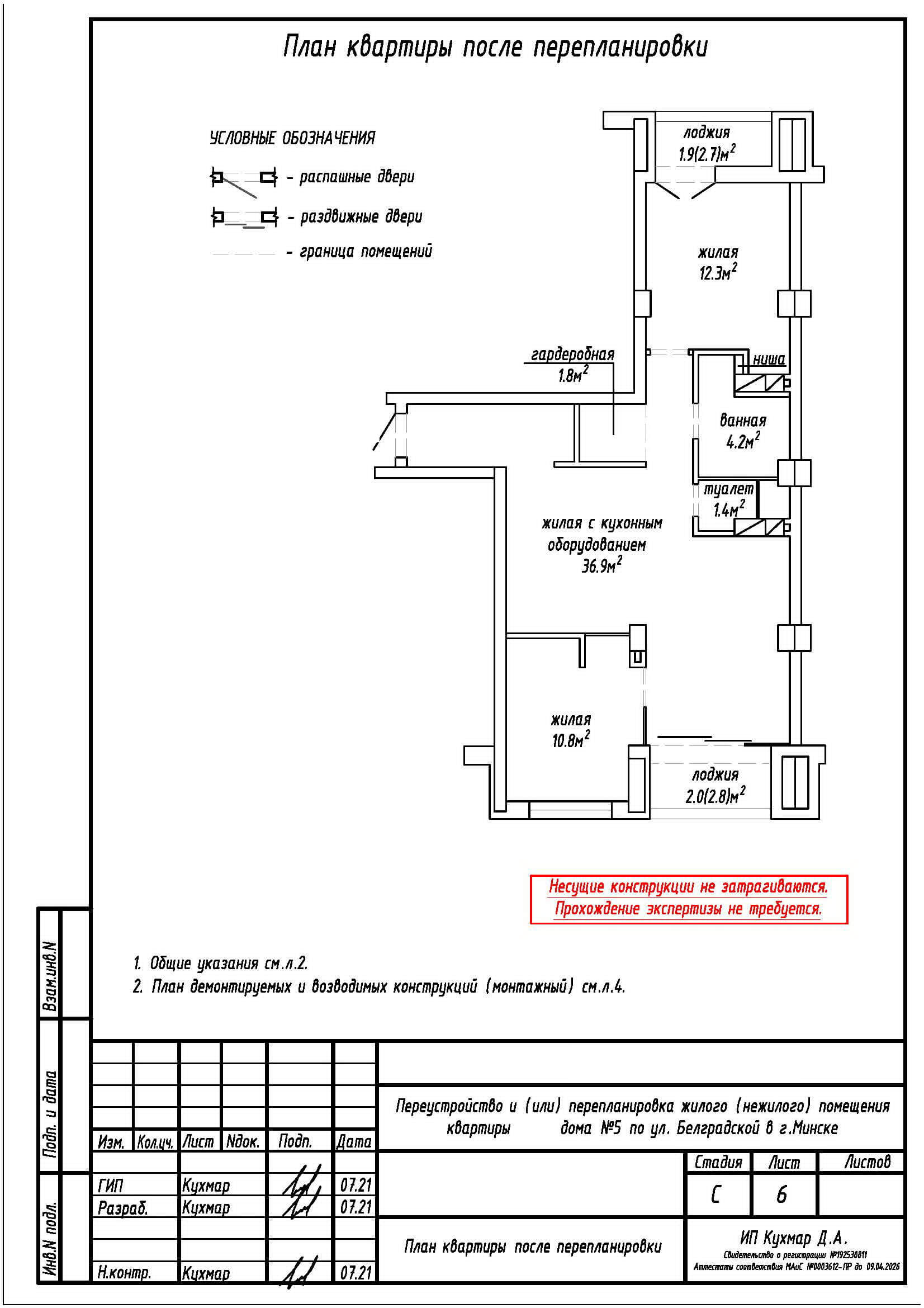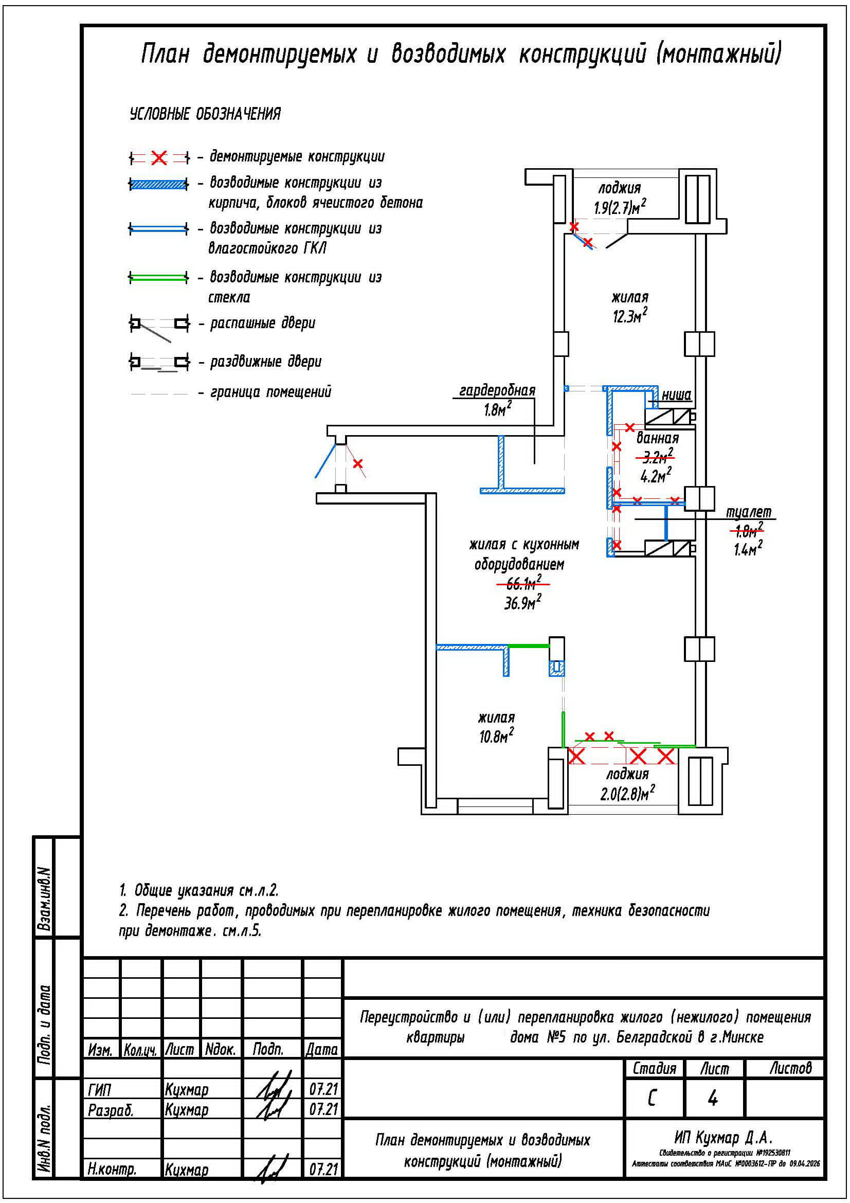- Демонтаж части стены с дверным блоком между жилой с кухонным оборудованием 66.1 м2 и лоджией 2.0(2.8) м2 с последующим устройством дверного блока;