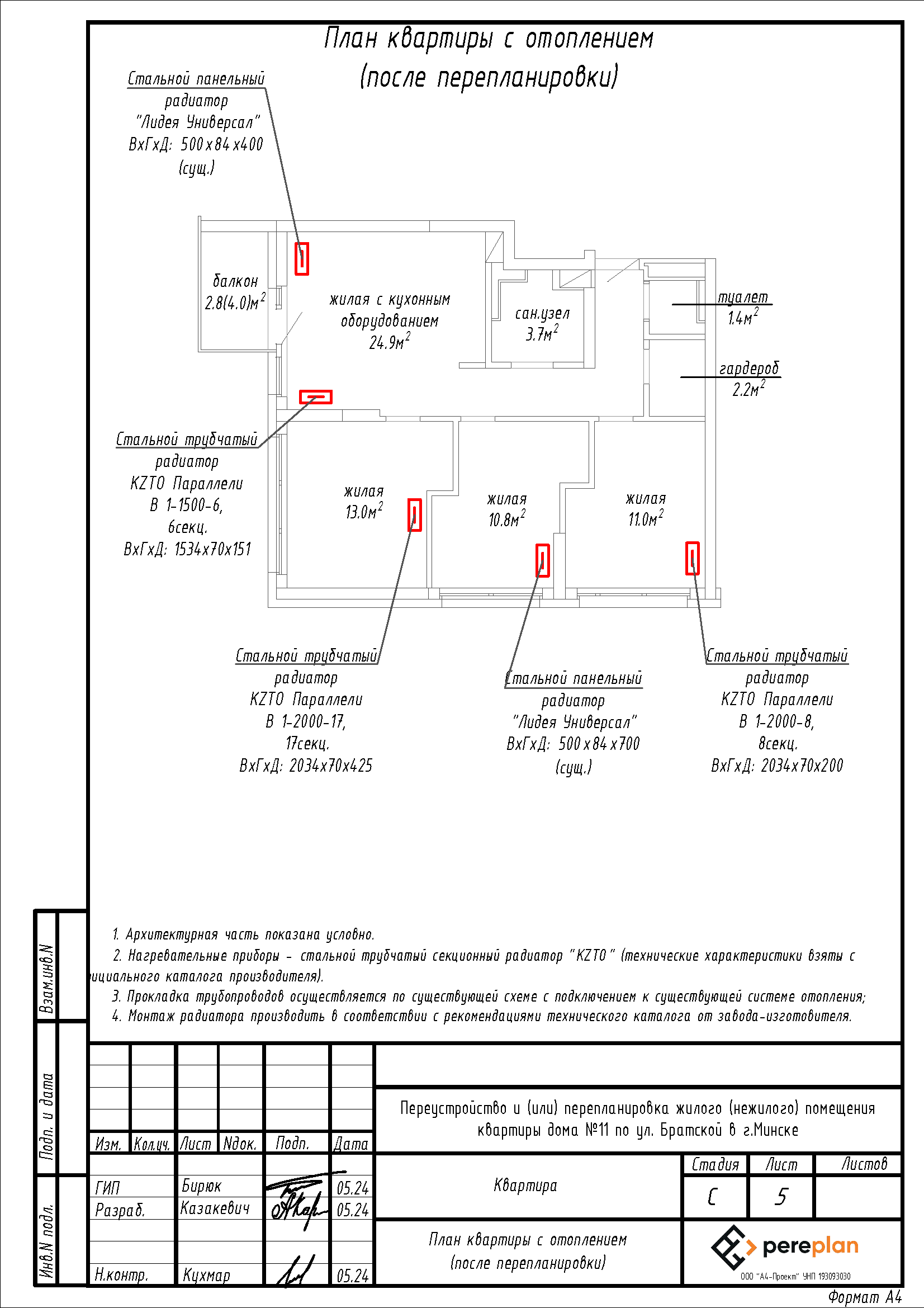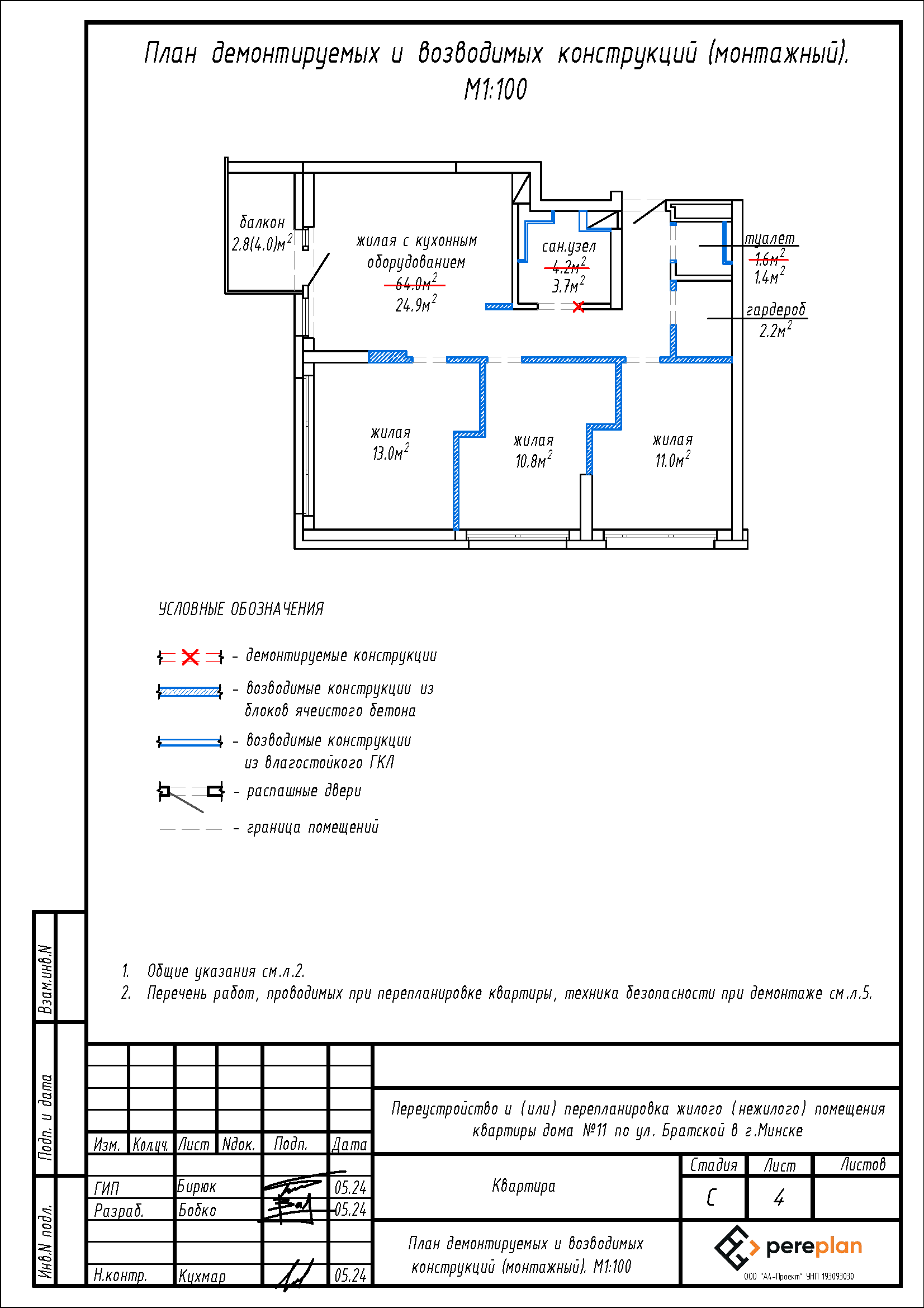 - Устройство перегородок с дверными проемами на площади жилой с кухонным оборудованием с целью устройства жилой с кухонным оборудованием, трех жилых и гардероба;