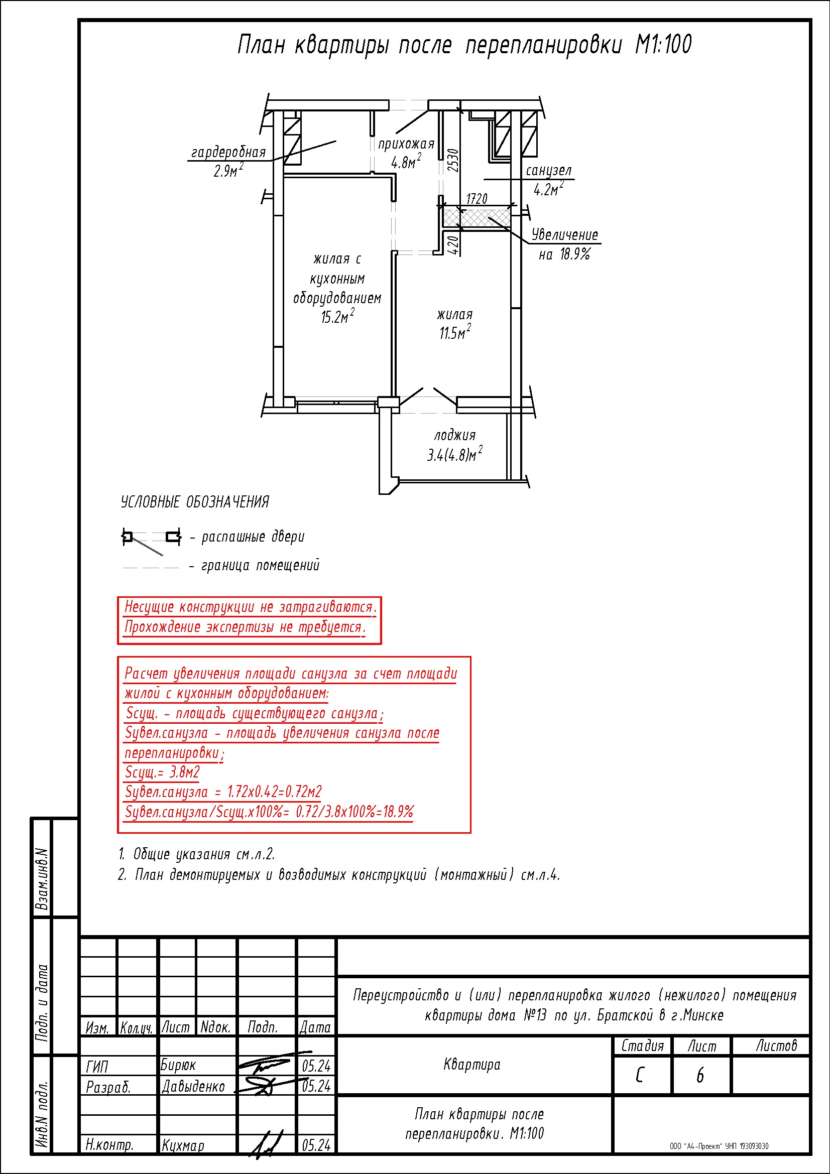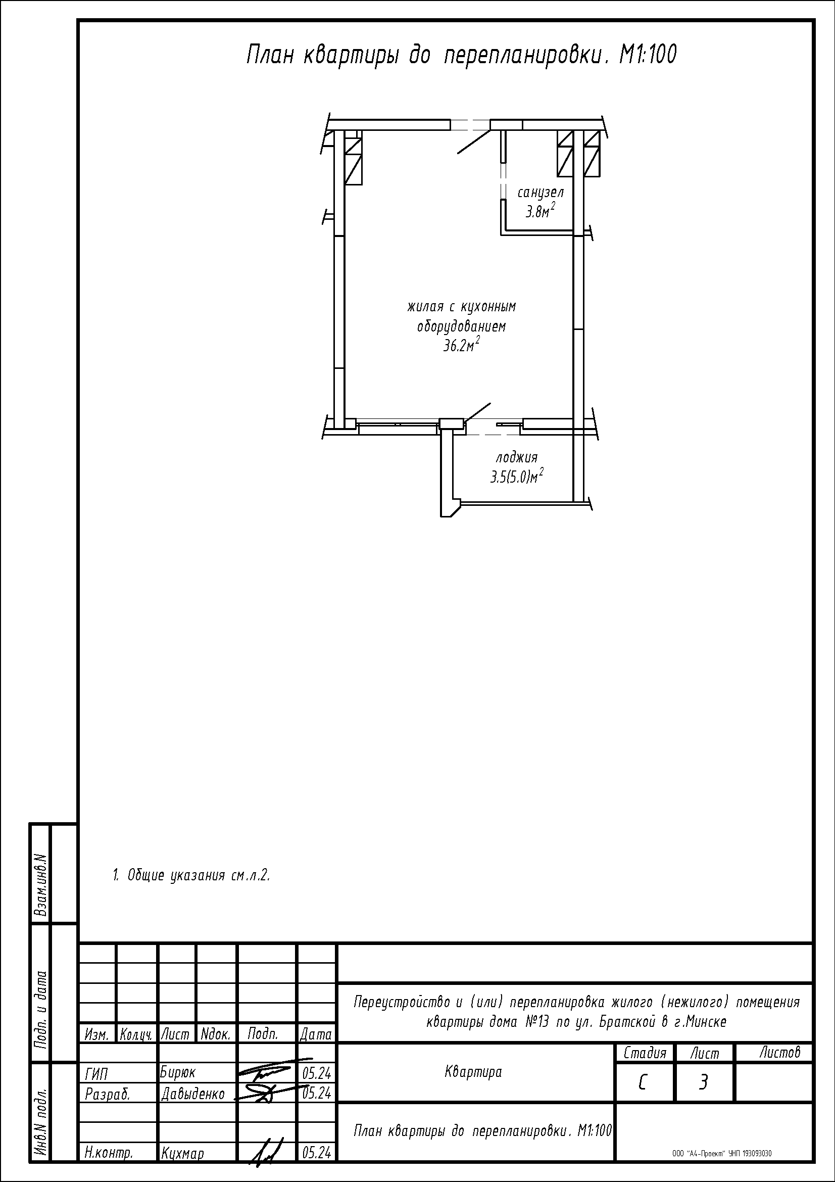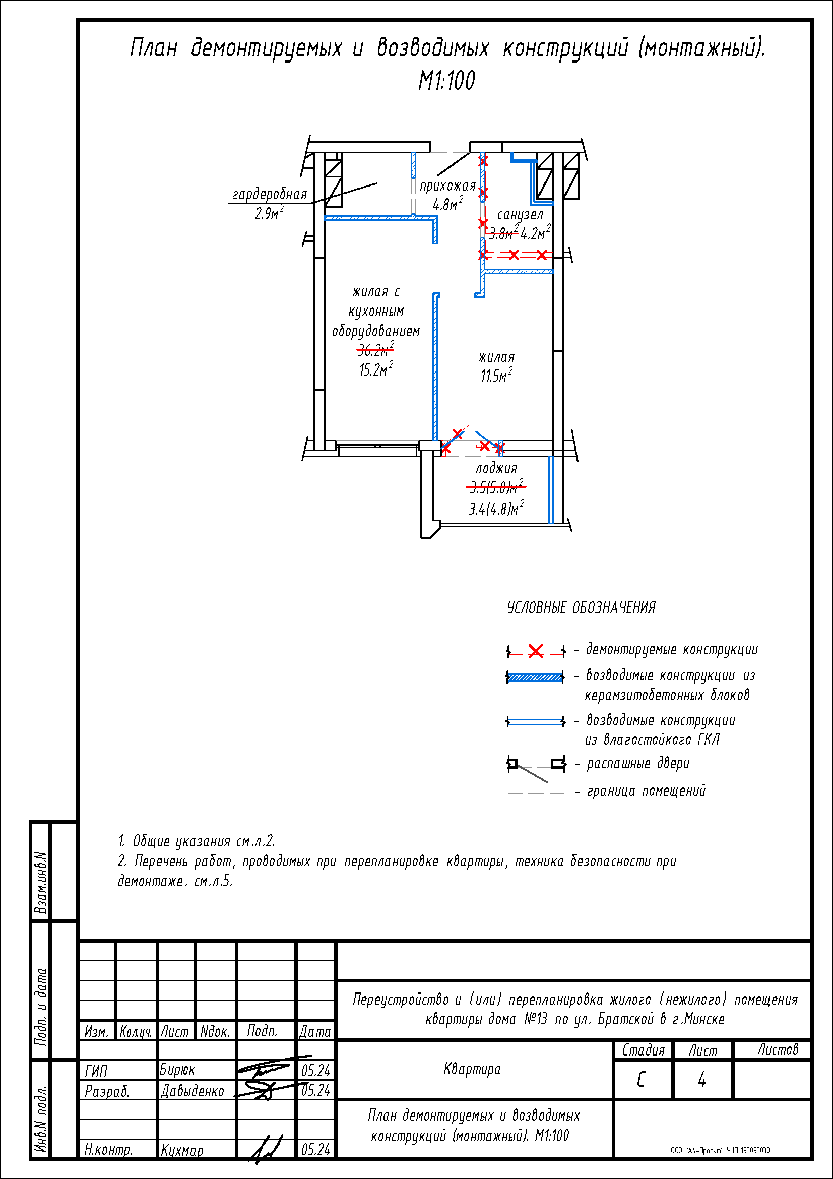 - Демонтаж перегородок с дверным проемом между санузлом 3.8 м2 и жилой с кухонным оборудованием 36.2 м2 с последующим устройством перегородок с дверными проемами на части площади санузла 3.8 м2 и жилой с кухонным оборудованием 36.2 м2 с последующим образованием помещений: жилой с кухонным оборудованием, жилой, гардеробной, прихожей и санузла;