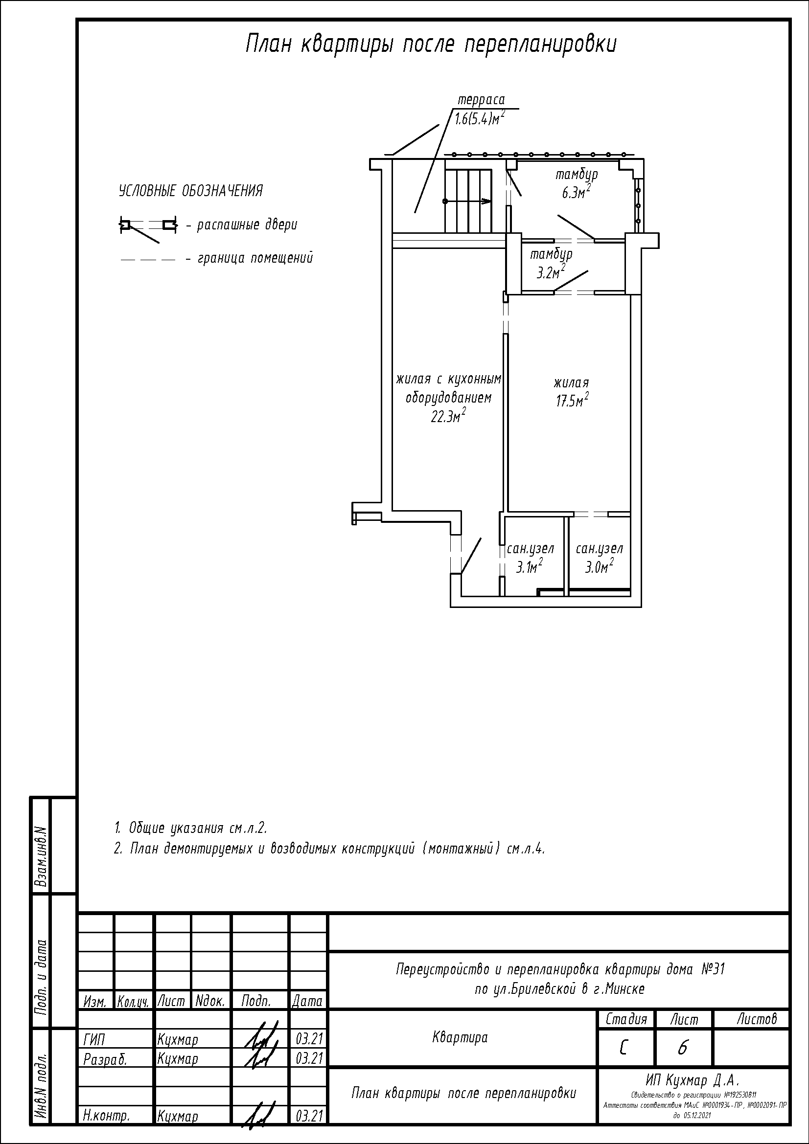 - Демонтаж перегородки между жилой с кухонным оборудованием и санузлом, с последующим устройством перегородок с дверными проемами на части площади жилой с кухонным оборудованием и санузла, с целью устройства жилой с кухонным оборудованием, жилой и двух санузлов;