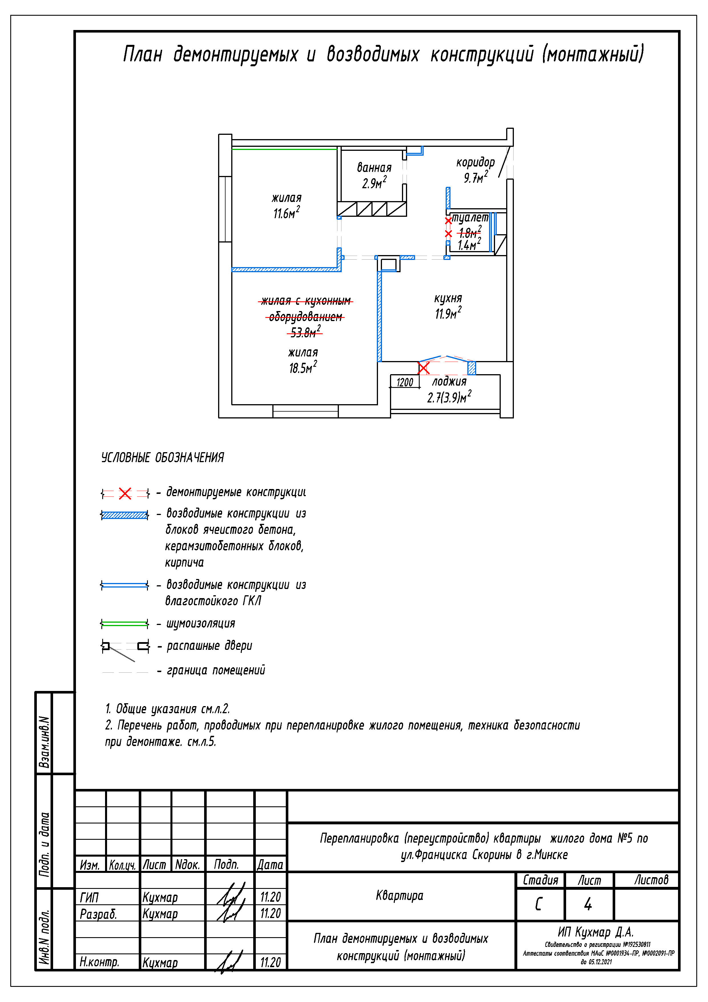 - Разделение общего помещения жилой с кухонным оборудованием на две отдельные жилые, кухню, коридор;