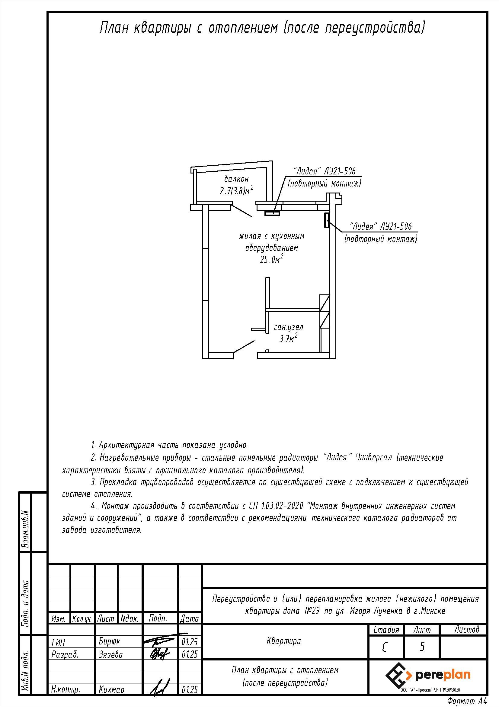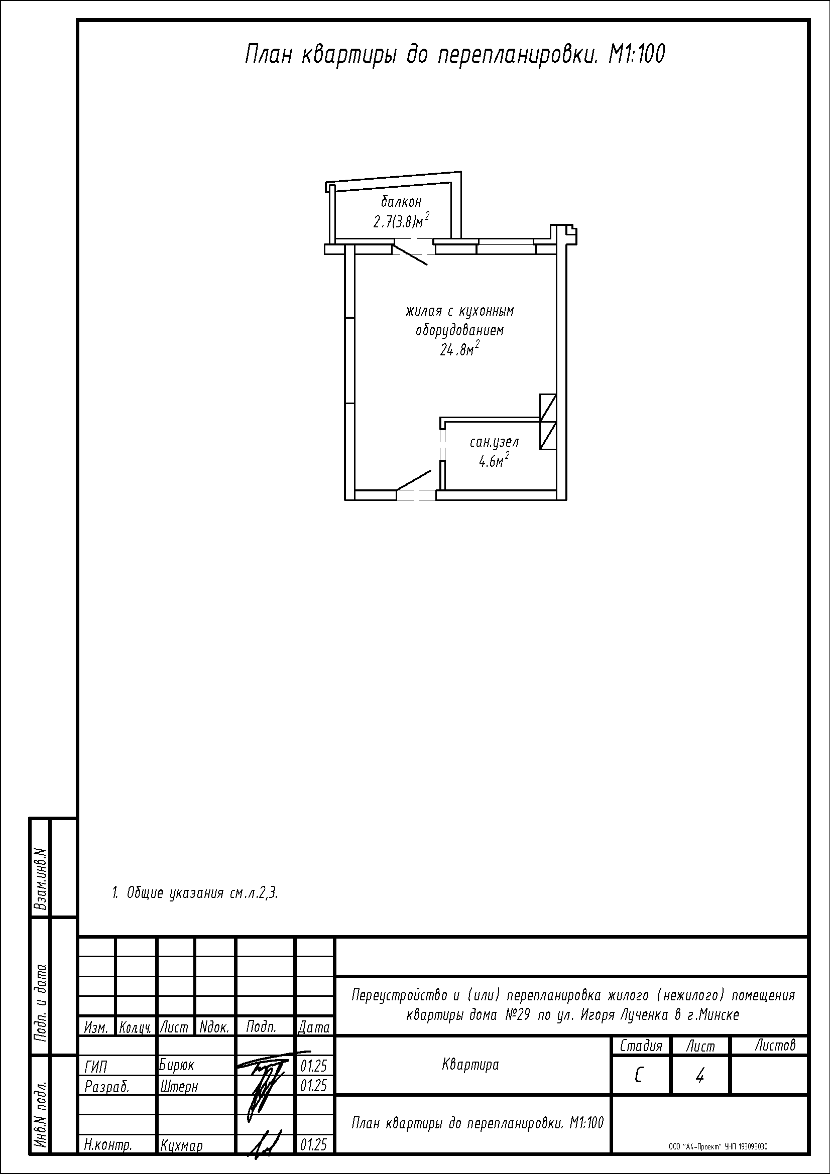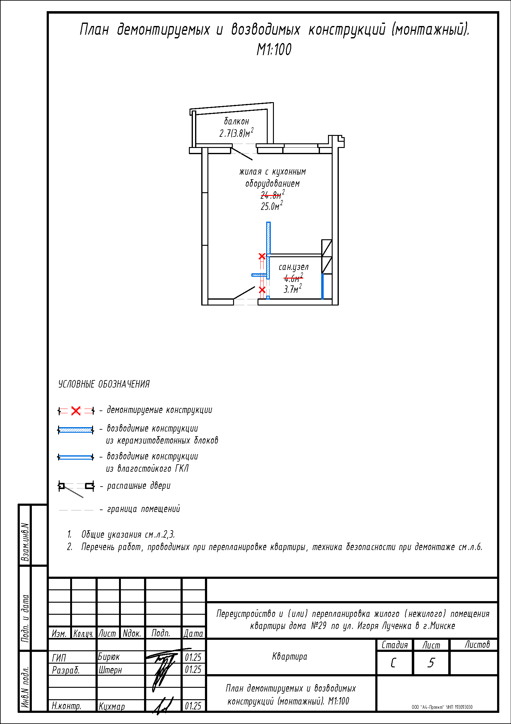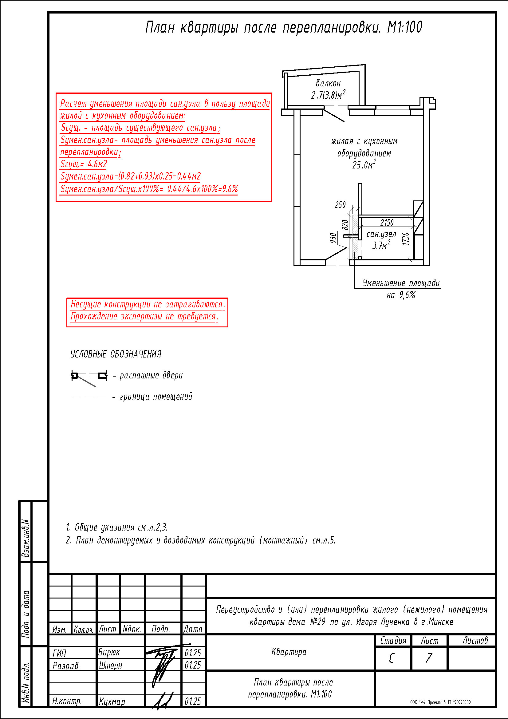 - Демонтаж части перегородки с дверным проемом между санузлом и жилой с кухонным оборудованием с последующим устройством перегородок с дверным проемом и зашивок ГКЛ на части площади санузла и жилой с кухонным оборудованием с целью устройства санузла и жилой с кухонным оборудованием.