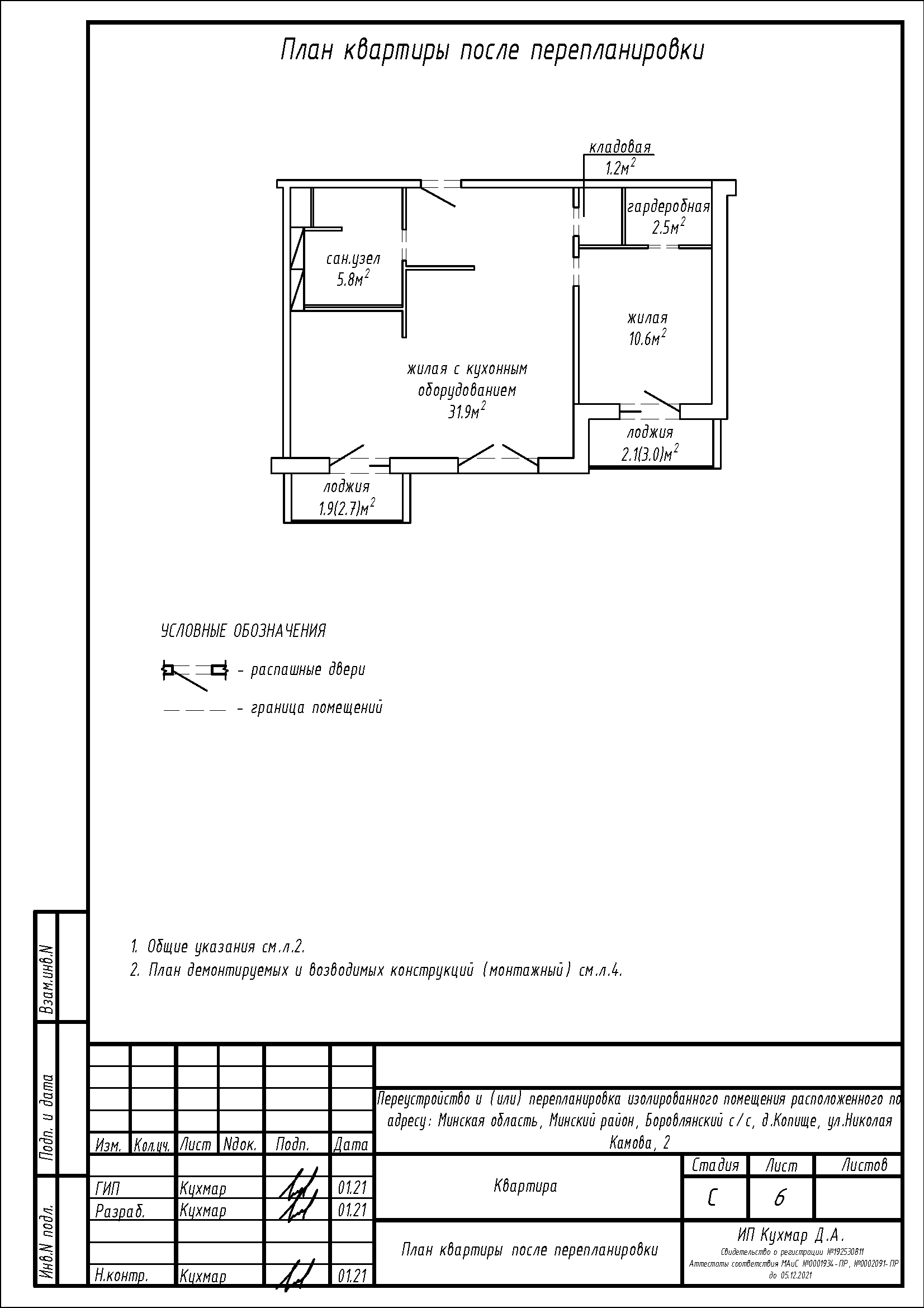 - Разделение общего помещения «жилая с кухонным оборудованием» на отдельную жилую, жилую с кухонным оборудованием, гардеробную, кладовую;