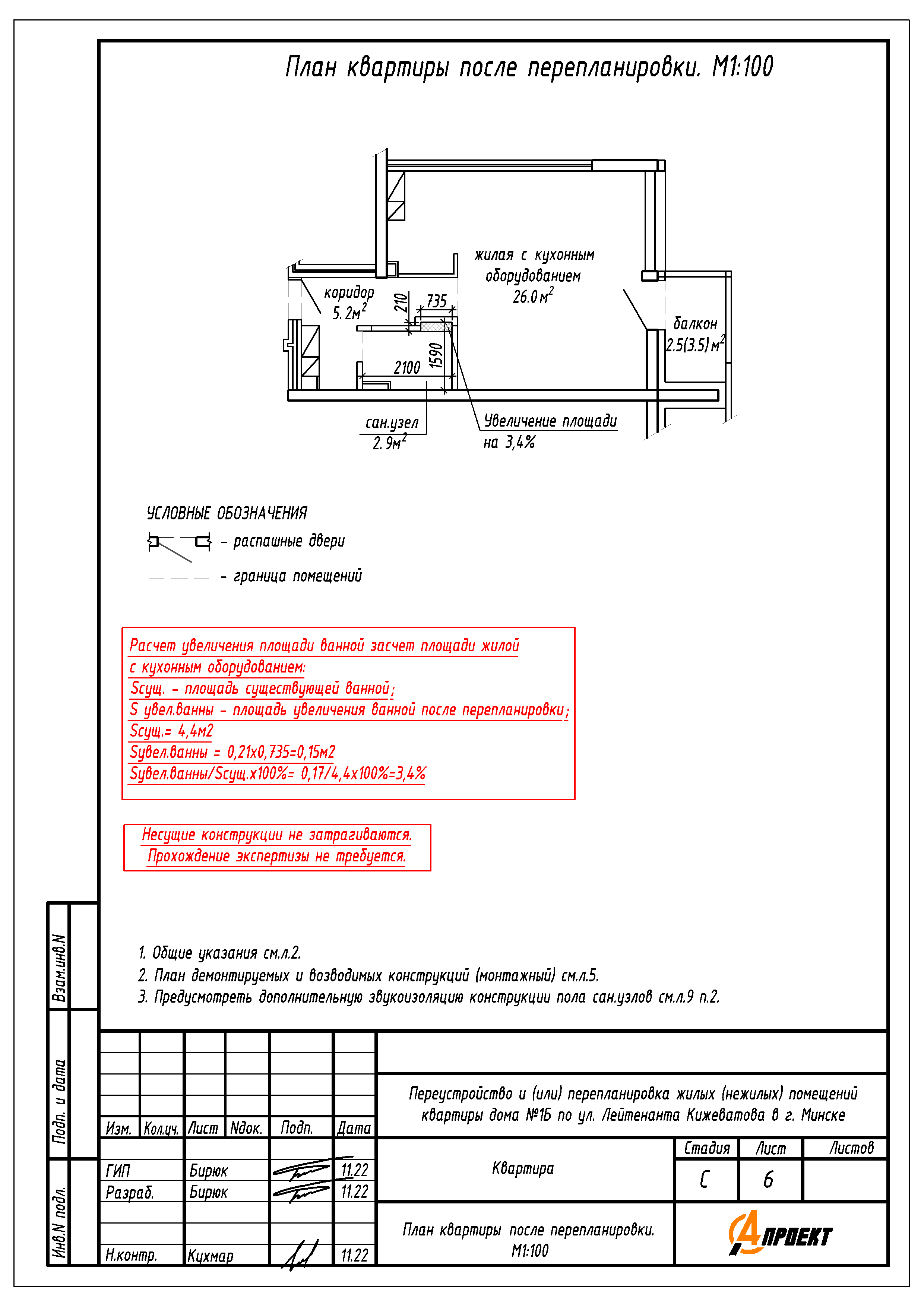 Перепланировка квартиры по ул. Кижеватова, 1Б в ЖК «Минск Мир»