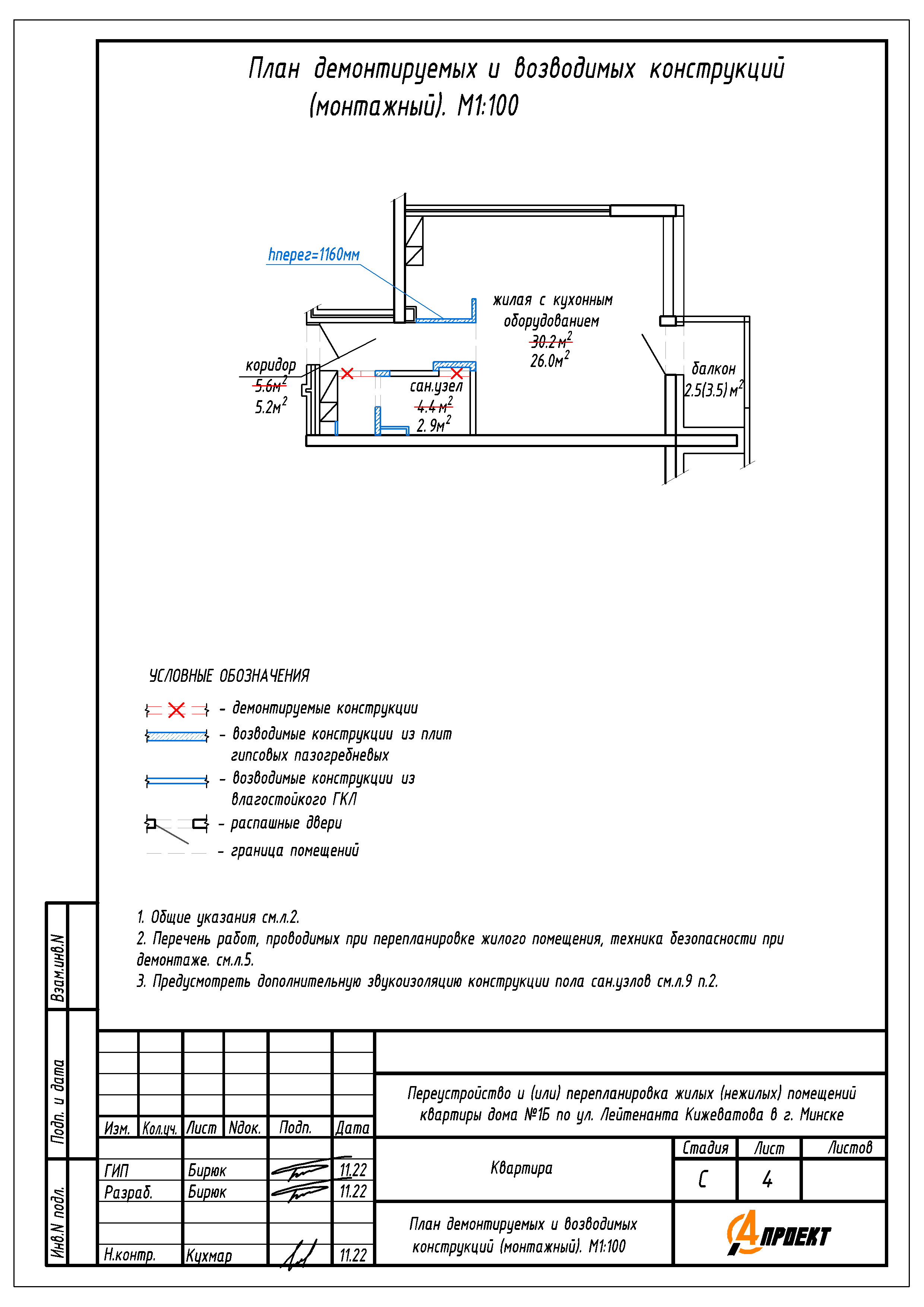 - Демонтаж части перегородки с дверным проёмом между жилой с кухонным оборудованием и санузлом;