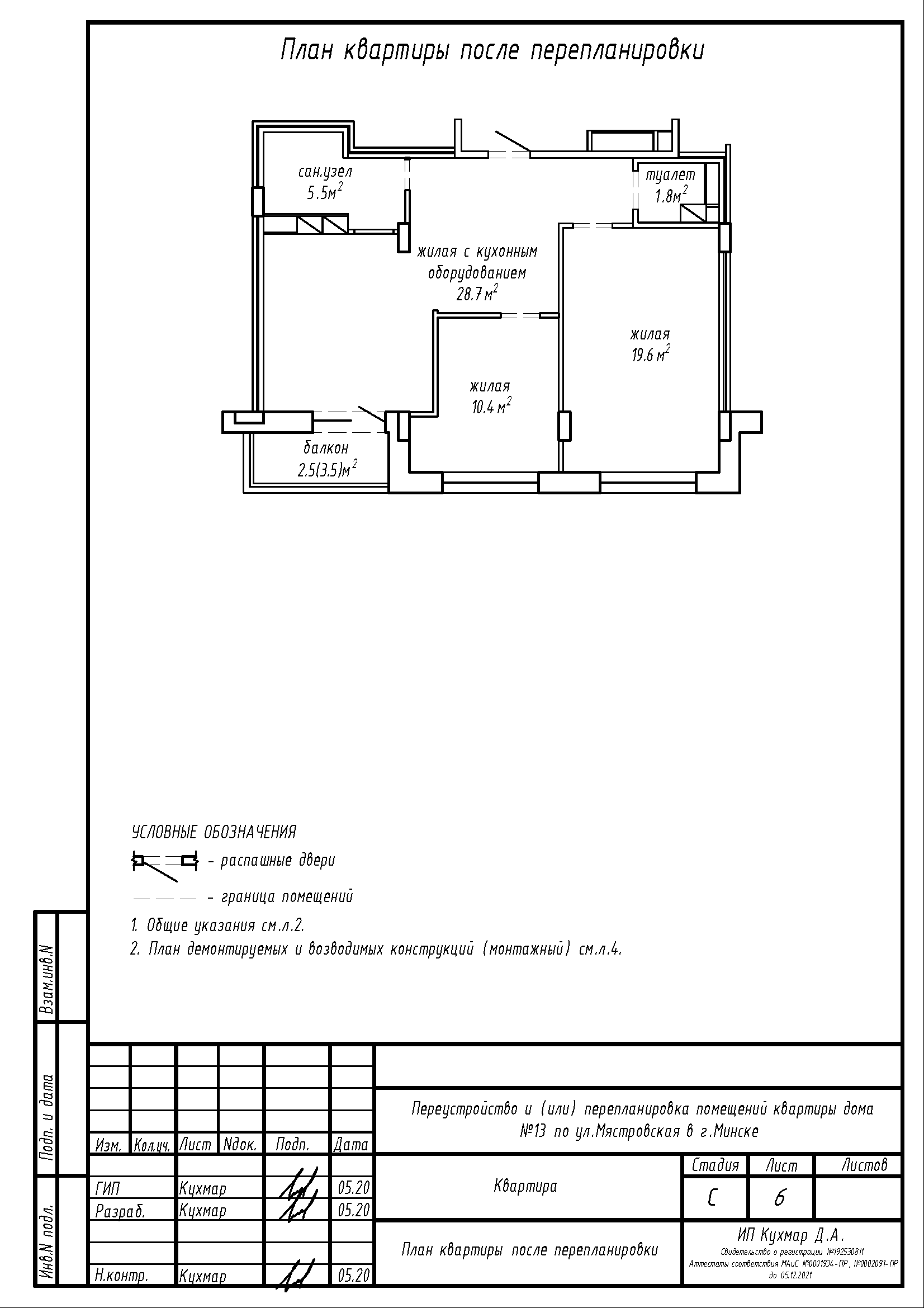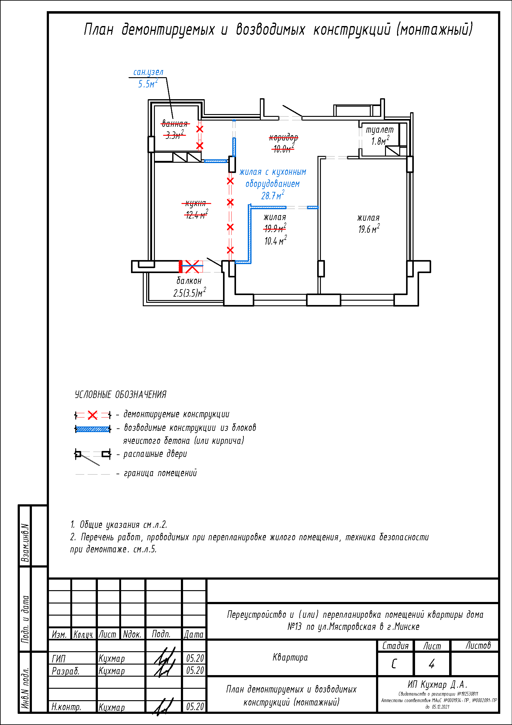 - Демонтаж перегородки между кухней, коридором и части жилой, с целью устройства жилой с кухонным оборудованием;