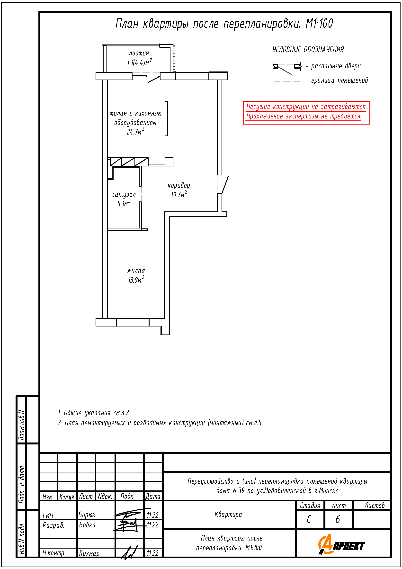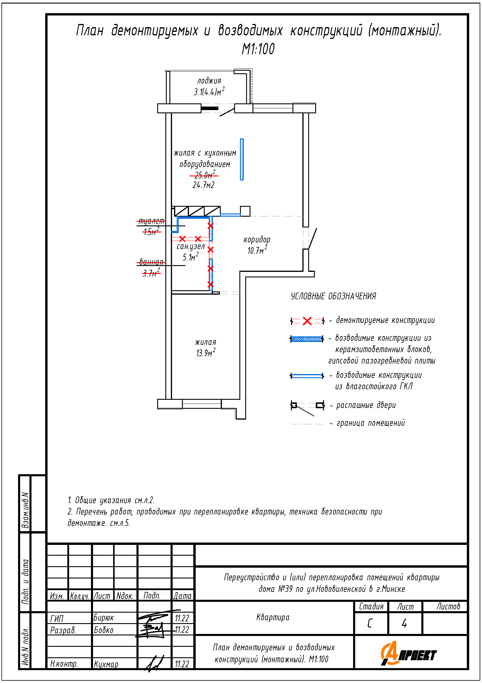 - Устройство перегородок на части площади жилой с кухонным оборудованием.