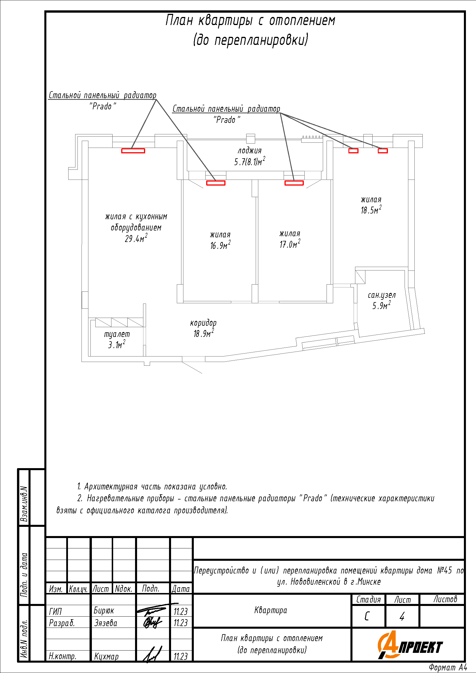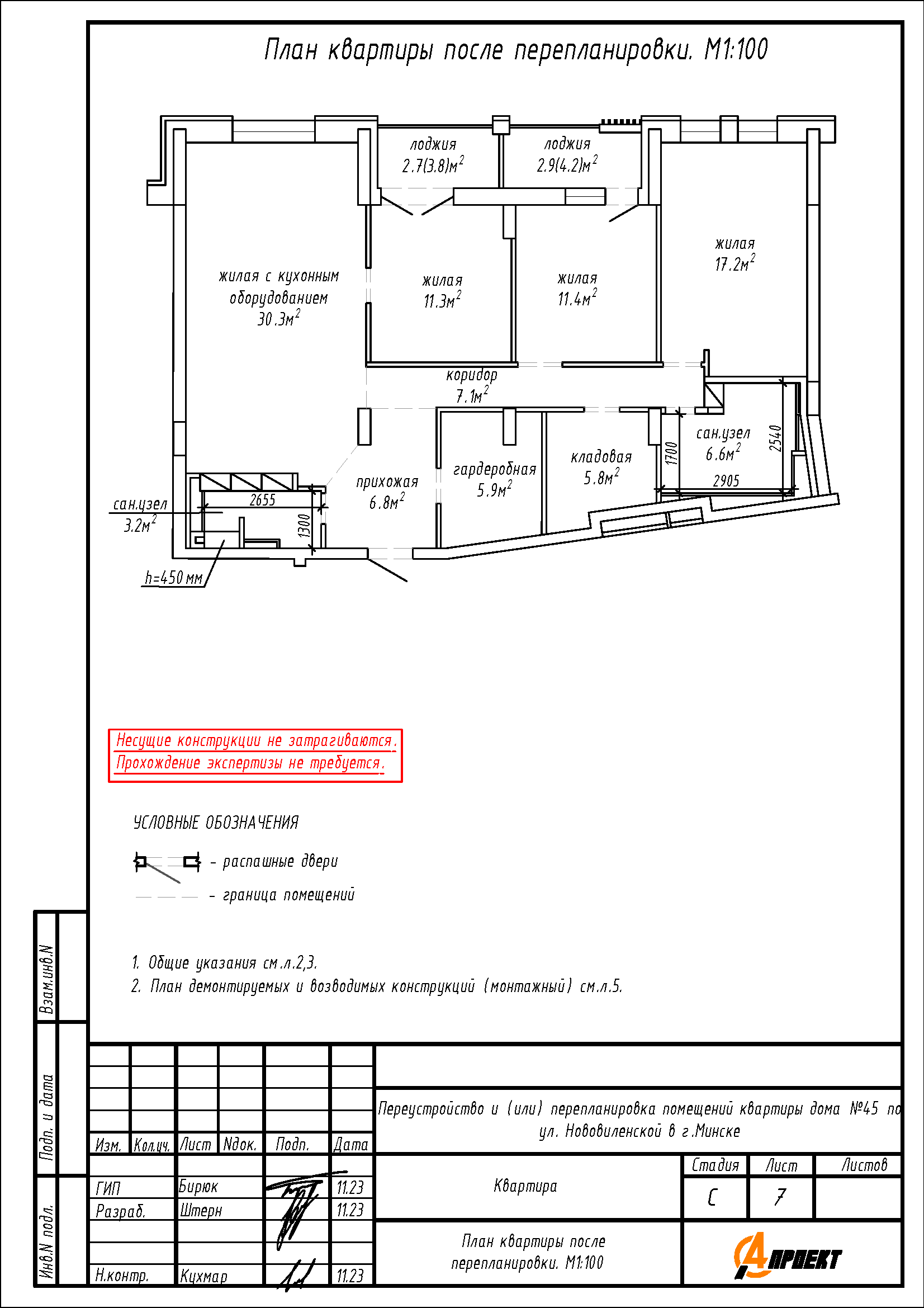 - Демонтаж части перегородок между коридором, туалетом, жилой комнатой с кухонным оборудованием, жилой комнатой площадью 16.9м2, жилой комнатой площадью 17.0м2, жилой комнатой площадью 18.5м2 и санузлом, с последующим устройством новых перегородок, образованием помещений: трех жилых комнат, жилой комнаты с кухонным оборудованием, гардероба, кладовой, двух коридоров и двух санузлов с увеличенной площадью;