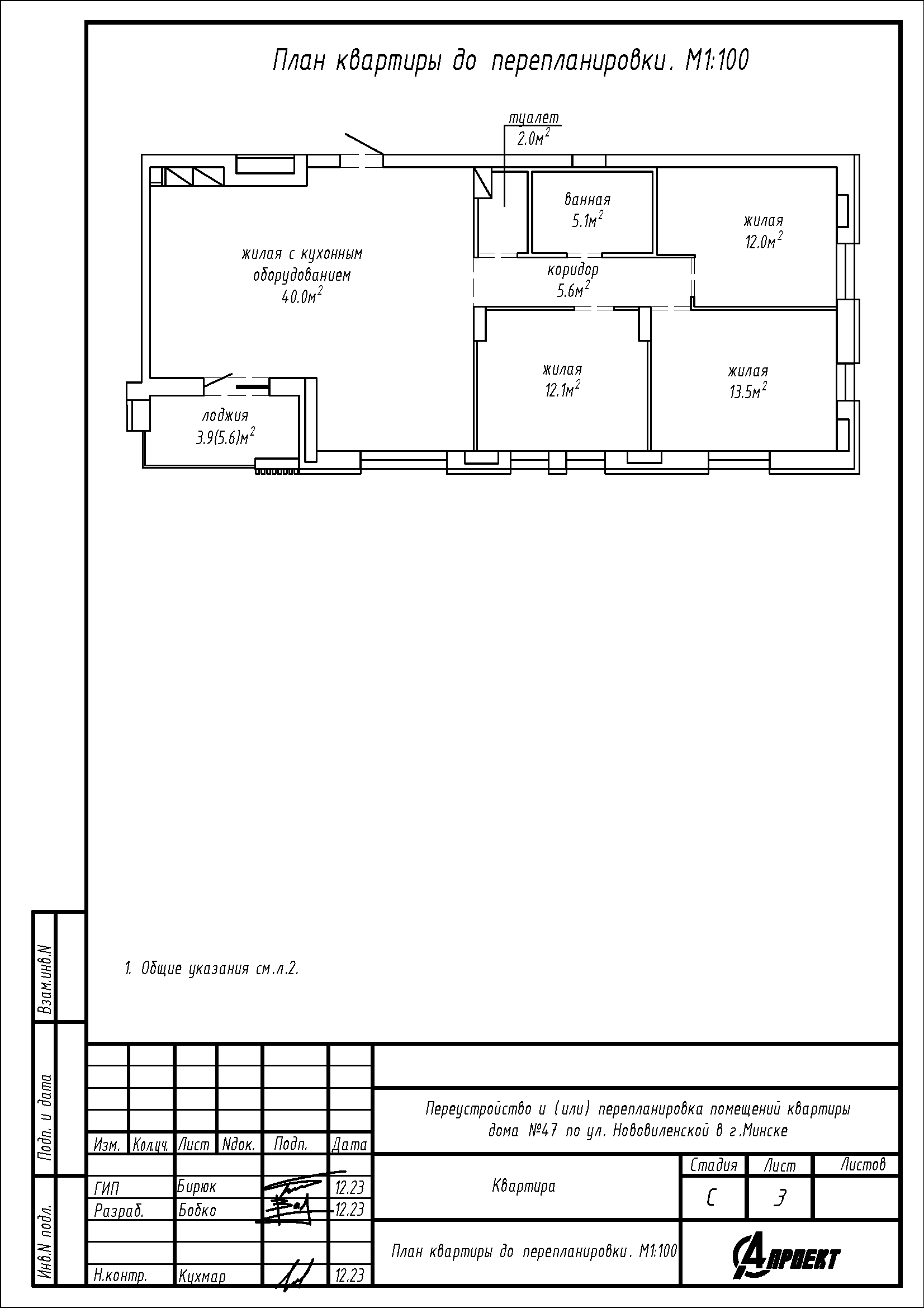 - Демонтаж части перегородок между жилой комнатой с кухонным оборудованием, жилой 12.1 м2, жилой комнаты площадью 13,5 м2, жилой комнатой площадью 12,0 м2, ванной, туалетом и коридором, с последующим устройством новых перегородок, образованием новых помещений: жилой комнаты с кухонным оборудованием, трёх жилых комнат, гардеробной, кладовой, коридора и санузлов;