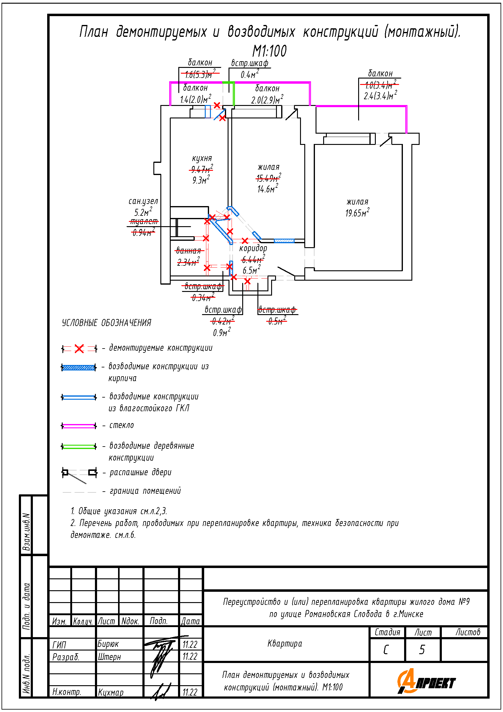 - Демонтаж встроенных шкафов в квартире, перегородок с дверными проёмами между санузлами и коридором, части перегородок между санузлами, перегородки с дверным проёмом между кухней и коридором, части перегородок между жилой комнатой и коридором с последующим устройством встроенного шкафа на части площади коридора;