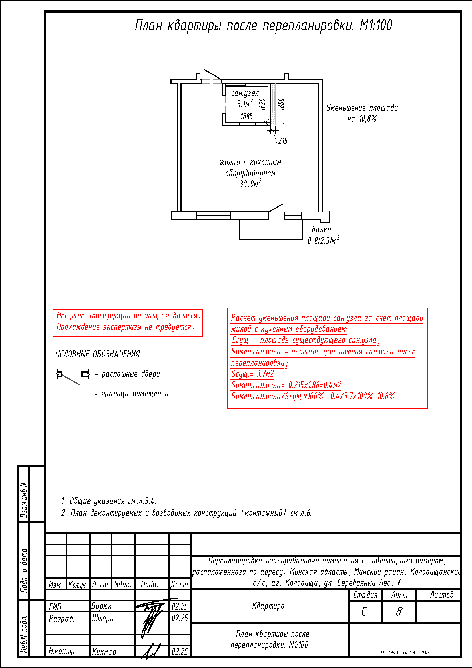 - Изменение площади жилого, санузла за счет демонтажа существующей перегородки между жилым и санузлом с последующим устройством перегородки на площади санузла;