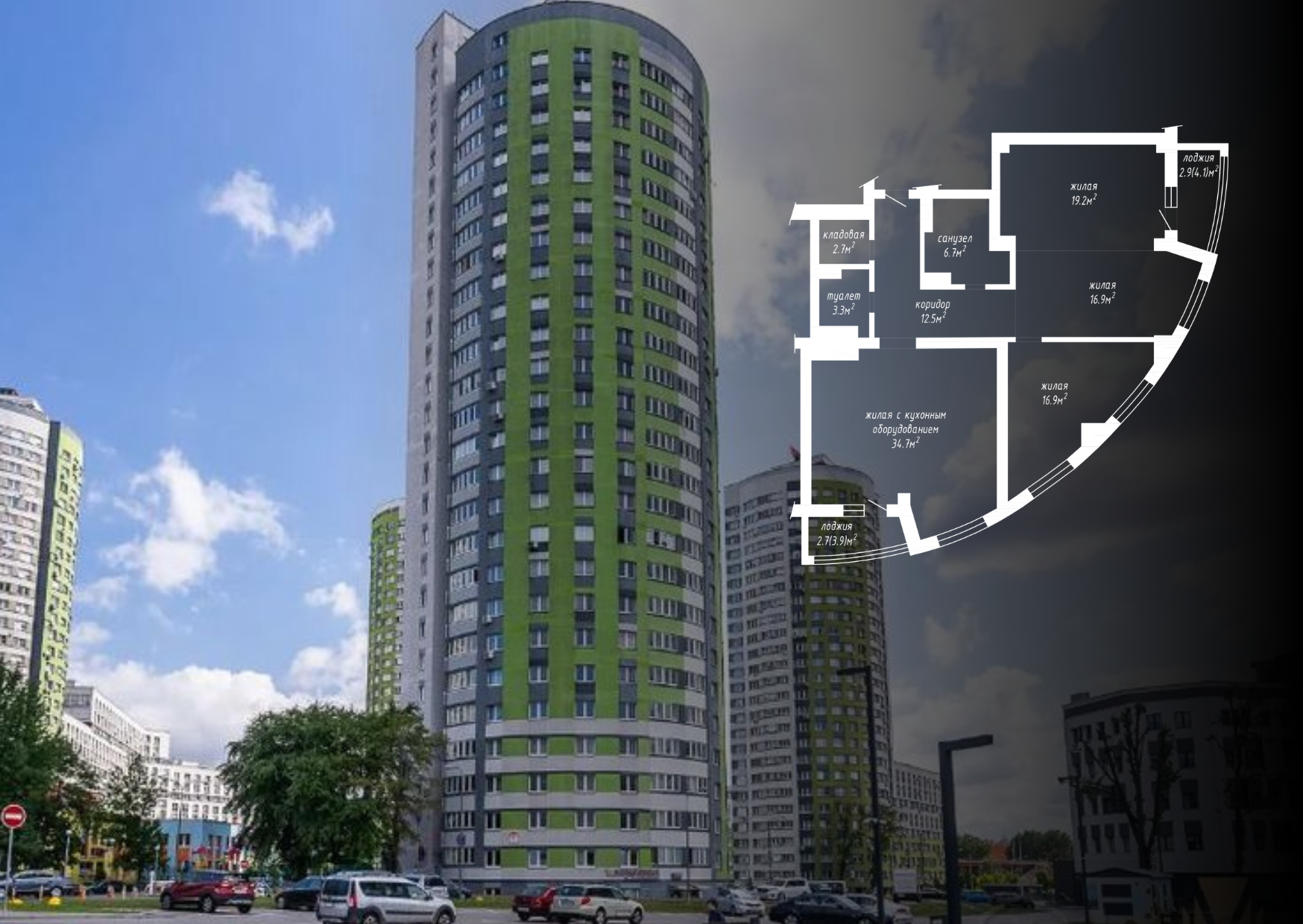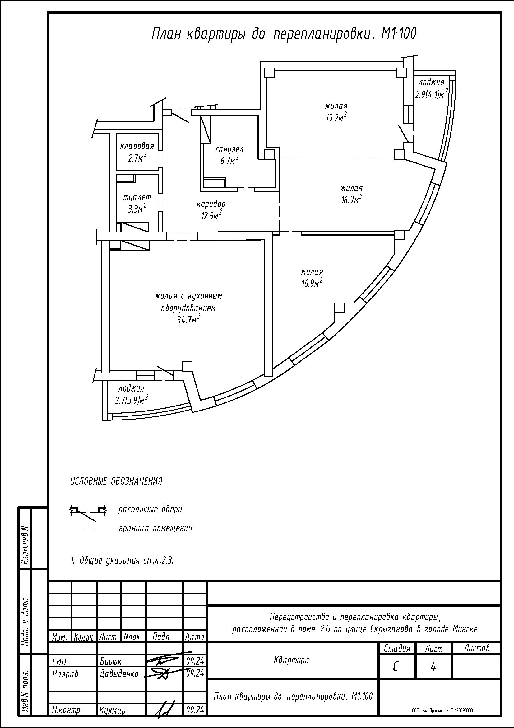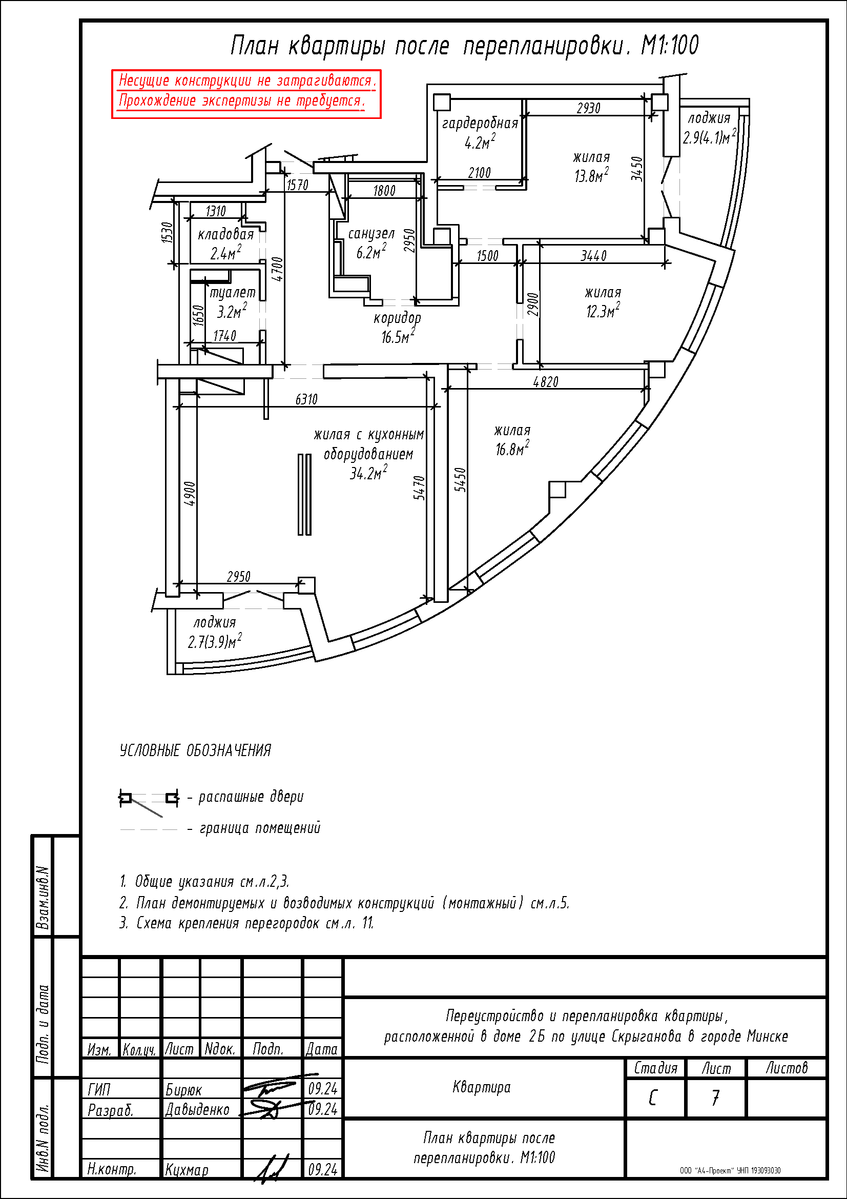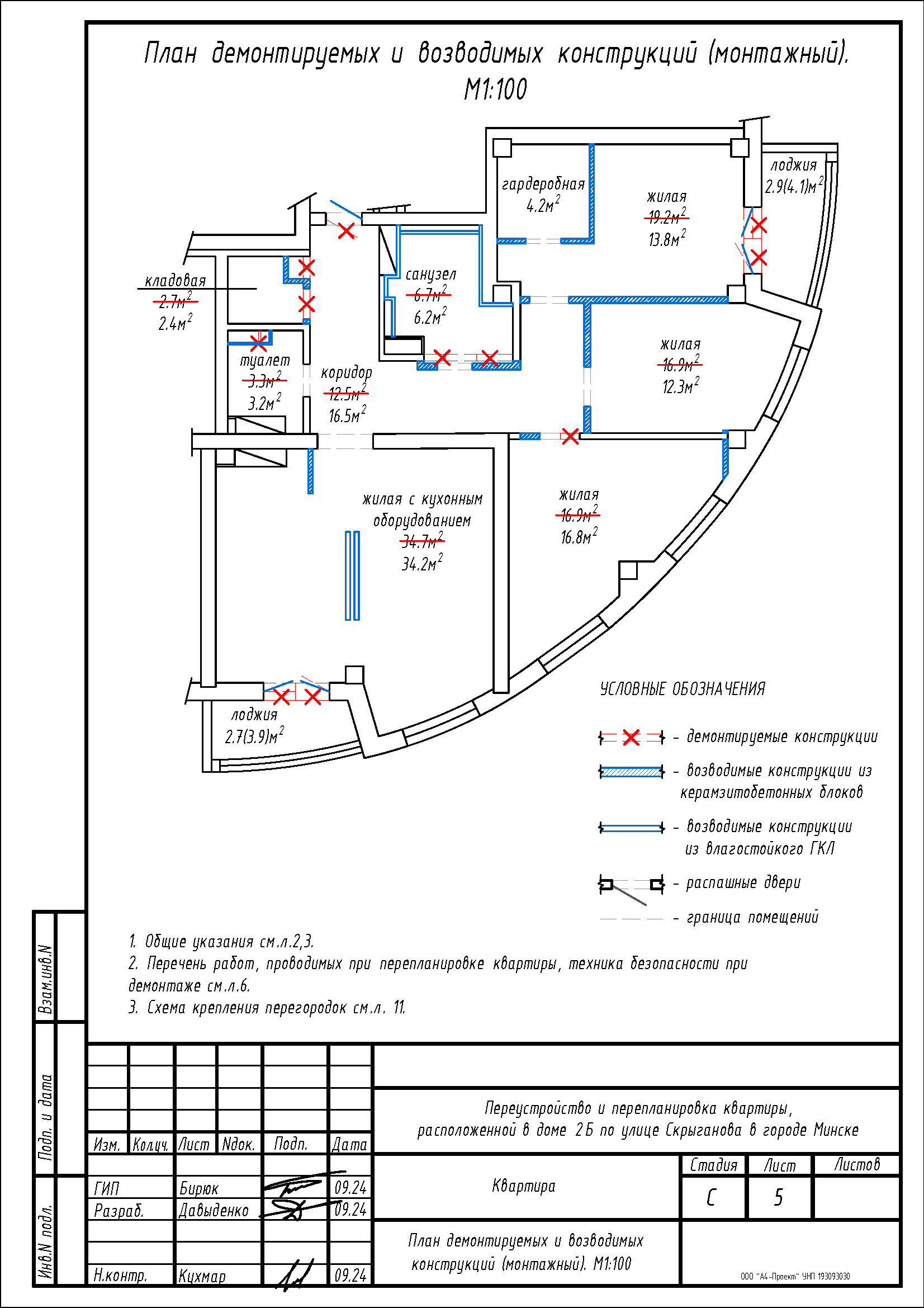 - Демонтаж перегородок с дверными проемами между коридором, кладовой и санузлом, с последующим устройством перегородок с дверными проемами на части площади кладовой, коридора, жилой с кухонным оборудованием, жилой 16.9м2, жилой 16.9м2 и жилой 19.2м2 с целью устройства гардеробной на части площади жилой 19.2м2;