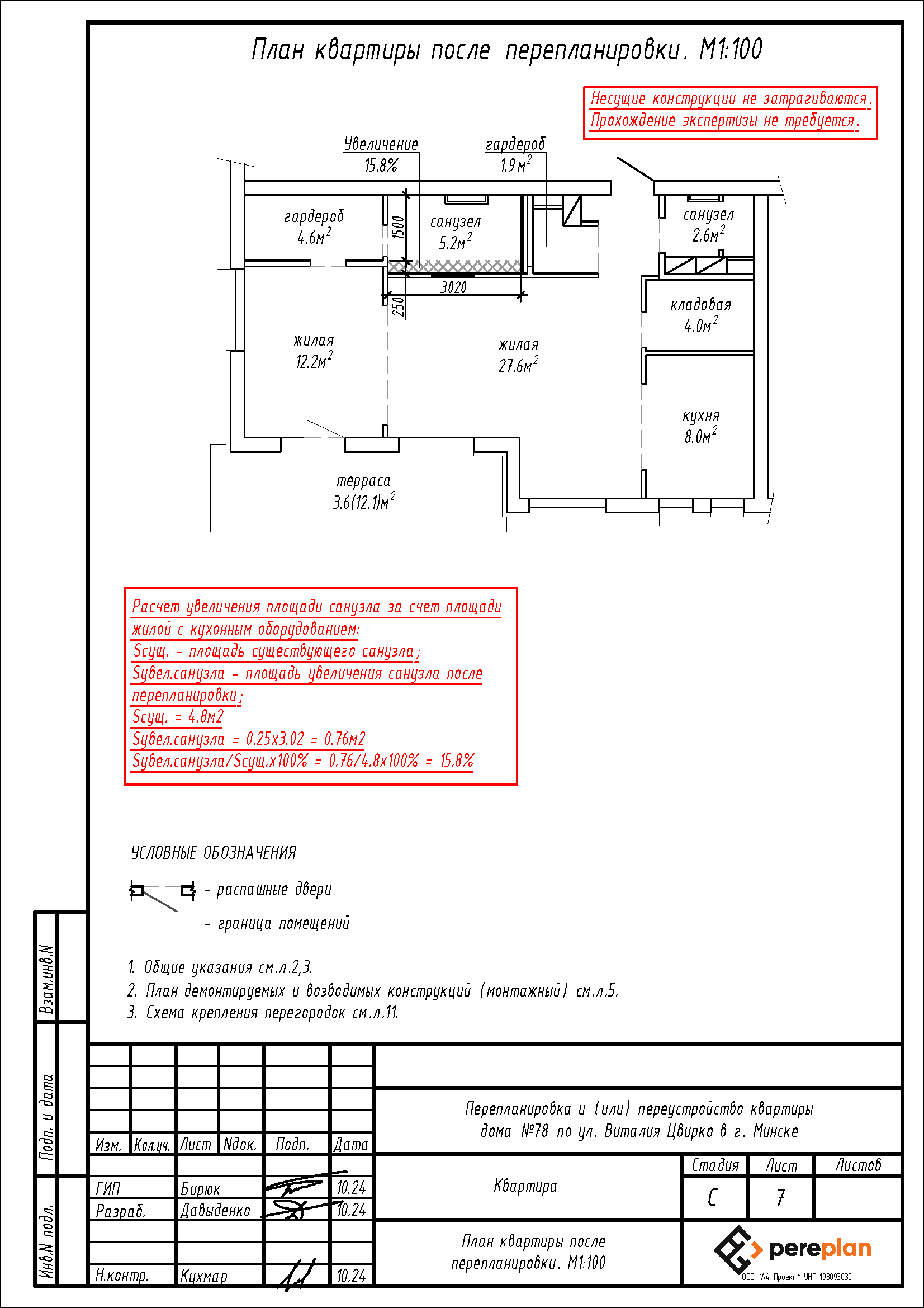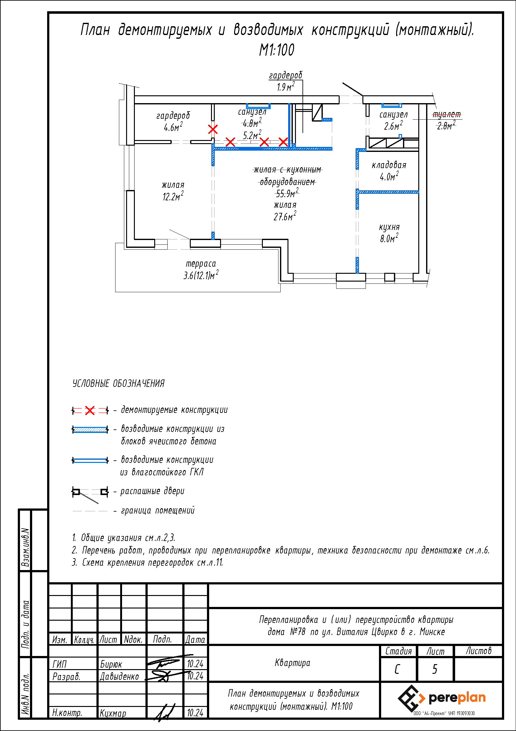 - Демонтаж части перегородки с дверным проемом между санузлом и жилой с кухонным оборудованием, с последующим устройством новых перегородок с дверными проемами на части площади санузла, жилой с кухонным оборудованием, туалета, с целью образования помещений: двух жилых, двух санузлов, двух гардеробов, кладовой и кухни;