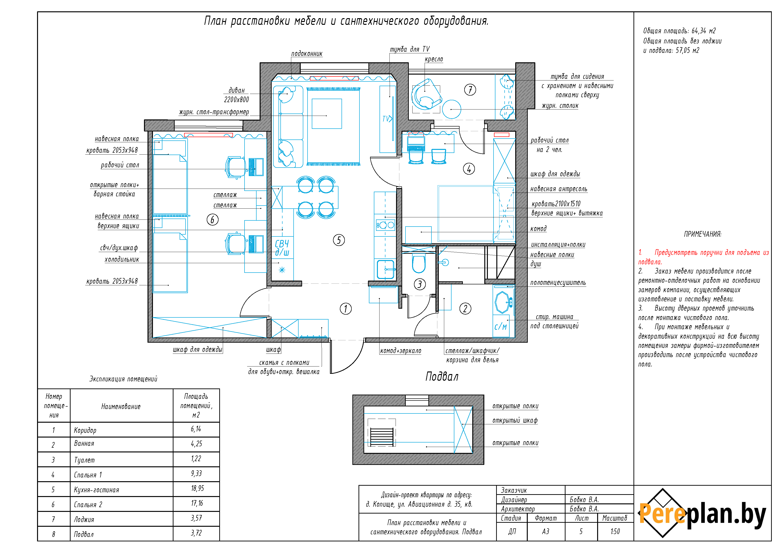 - Финальный план расстановки мебели и сантехнического оборудования. Размеры.