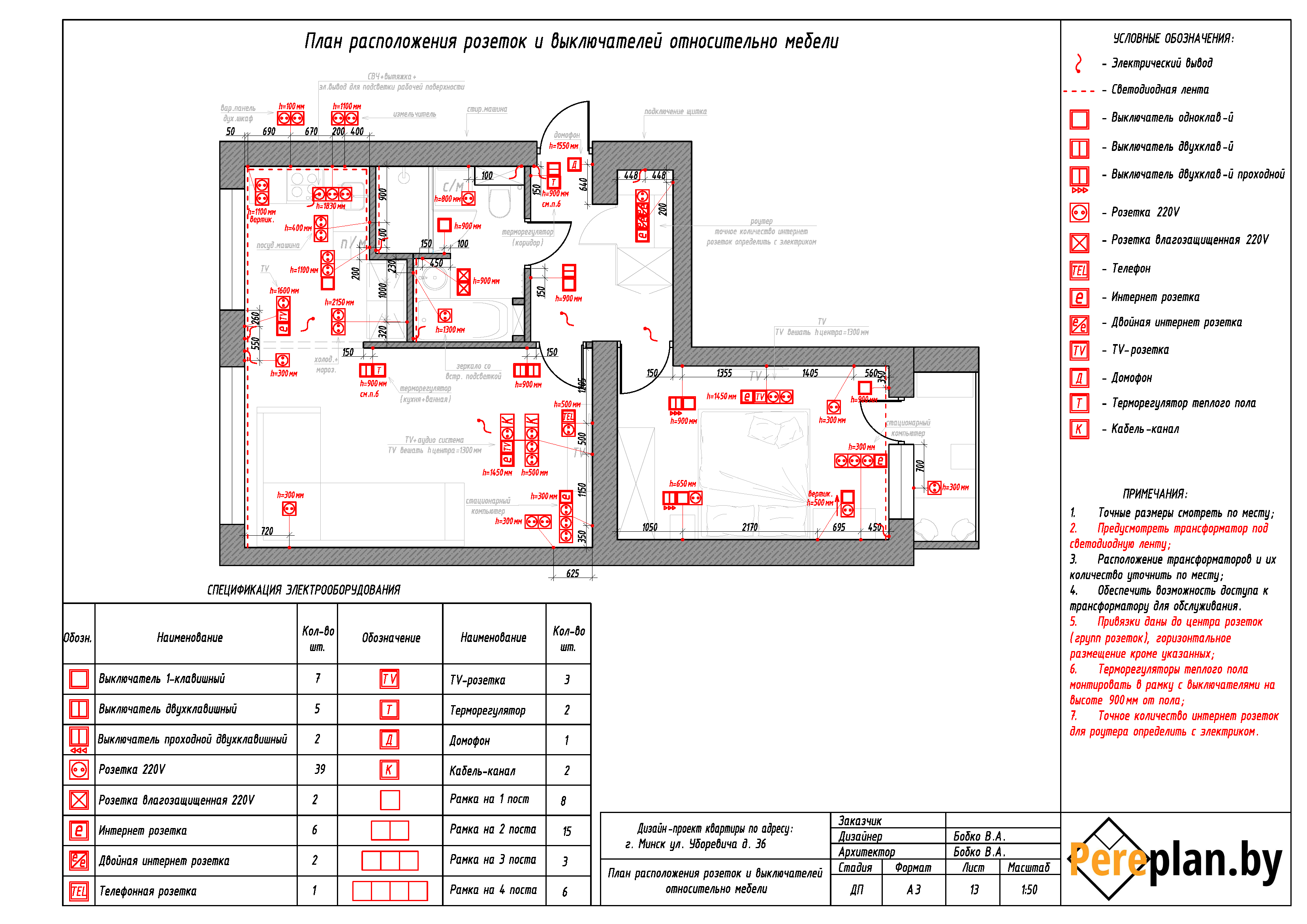 - План расположения розеток и выключателей относительно мебели.